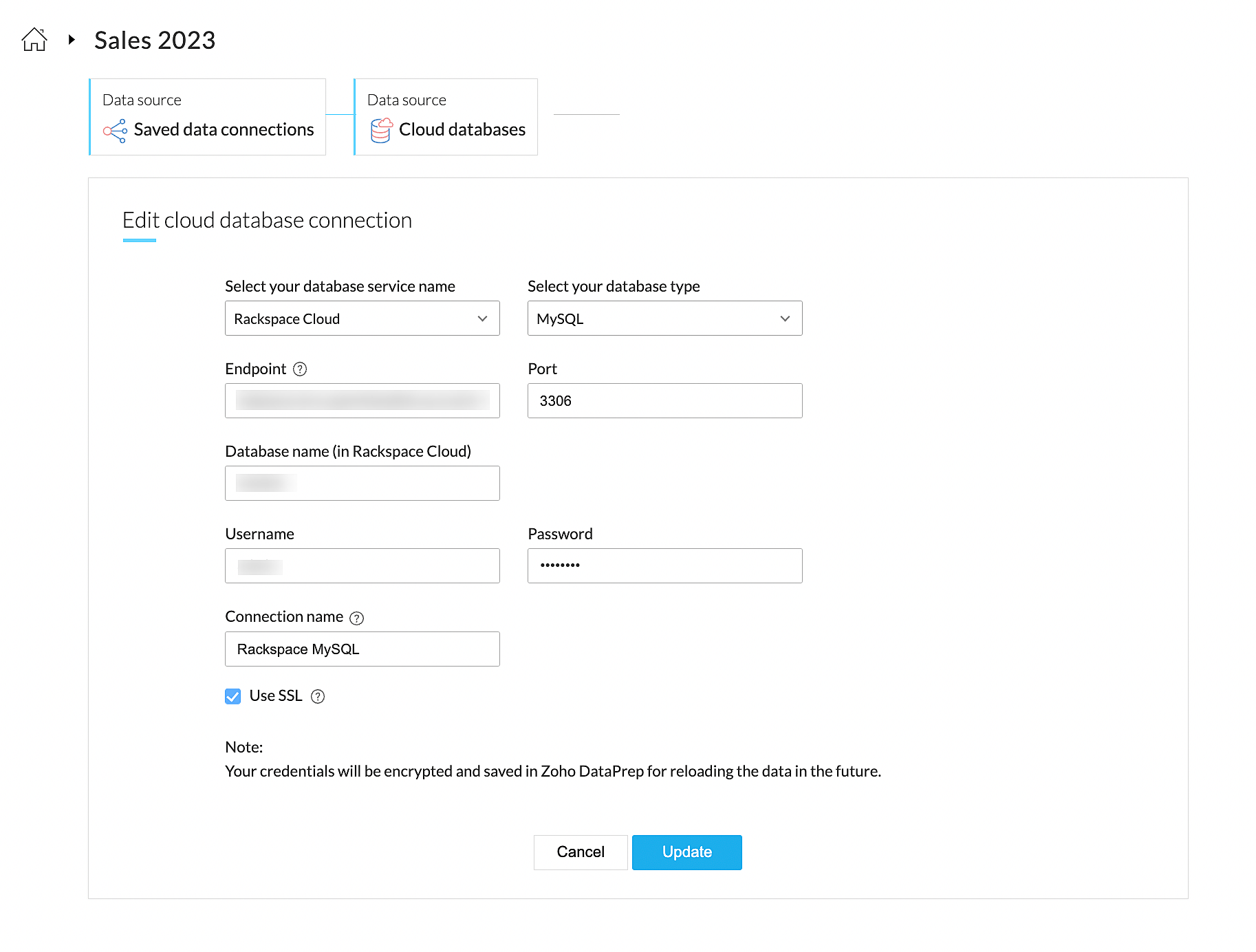 3. 編集 connection オプションをクリックします。保存された connection のパラメーターや認証情報をすべて更新でき、更新する をクリックしてください。