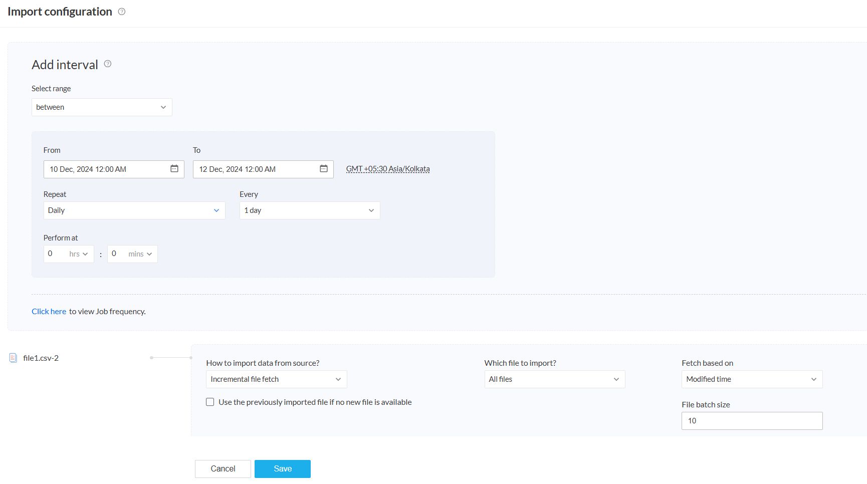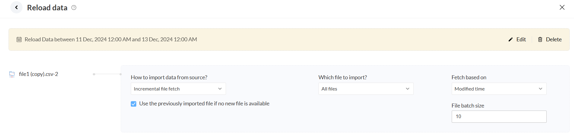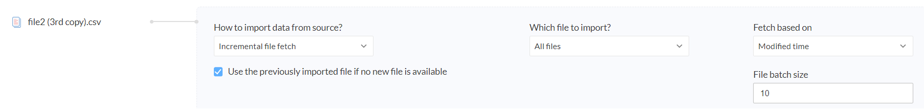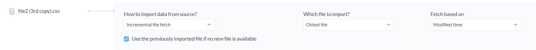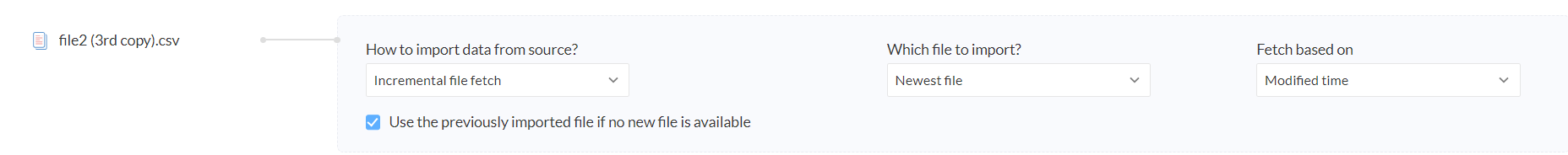 増分ファイルフェッチでは、パイプライン実行時に新規または更新済みファイルが取得されます。頻度データ間隔中は、直前のデータ間隔以降に作成または更新されたファイルがインポートされます。ローカルファイルパスに新規ファイルがない場合、データはインポートされず、または以前インポートされたデータがインポート設定に従い再び取得されます。次のデータ間隔では、その間隔内で作成または更新されたファイルが取得されます。