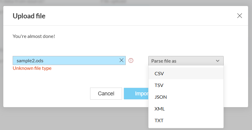 ファイルの種類: 必須のファイル形式を選択してください。利用可能なフォーマットはCSV、TSV、JSON、XLS、XLSX、XML、TXTです。