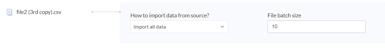 例えば、スケジュールが1時間間隔に設定されている場合、データ元には合計10ファイルがあり、そのうち5ファイルが1時間前にファイルパターンに照合してアップロードされました。インポートする設定はすべてのファイルをインクリメンタルにインポートするようになっており、バッチサイズは10に設定されています。