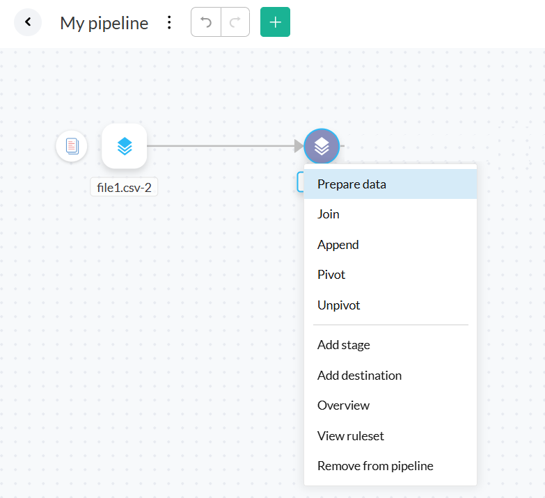5. インポートするボタンをクリックします。データのインポートが完了すると、Visual Pipeline builderが開き、変換の適用を開始できます。また、ステージを右クリックしてPrepare dataオプションを選択し、DataPrep Studioページでデータの準備を行うことも可能です。変換について詳しくはこちらをクリックしてください。
