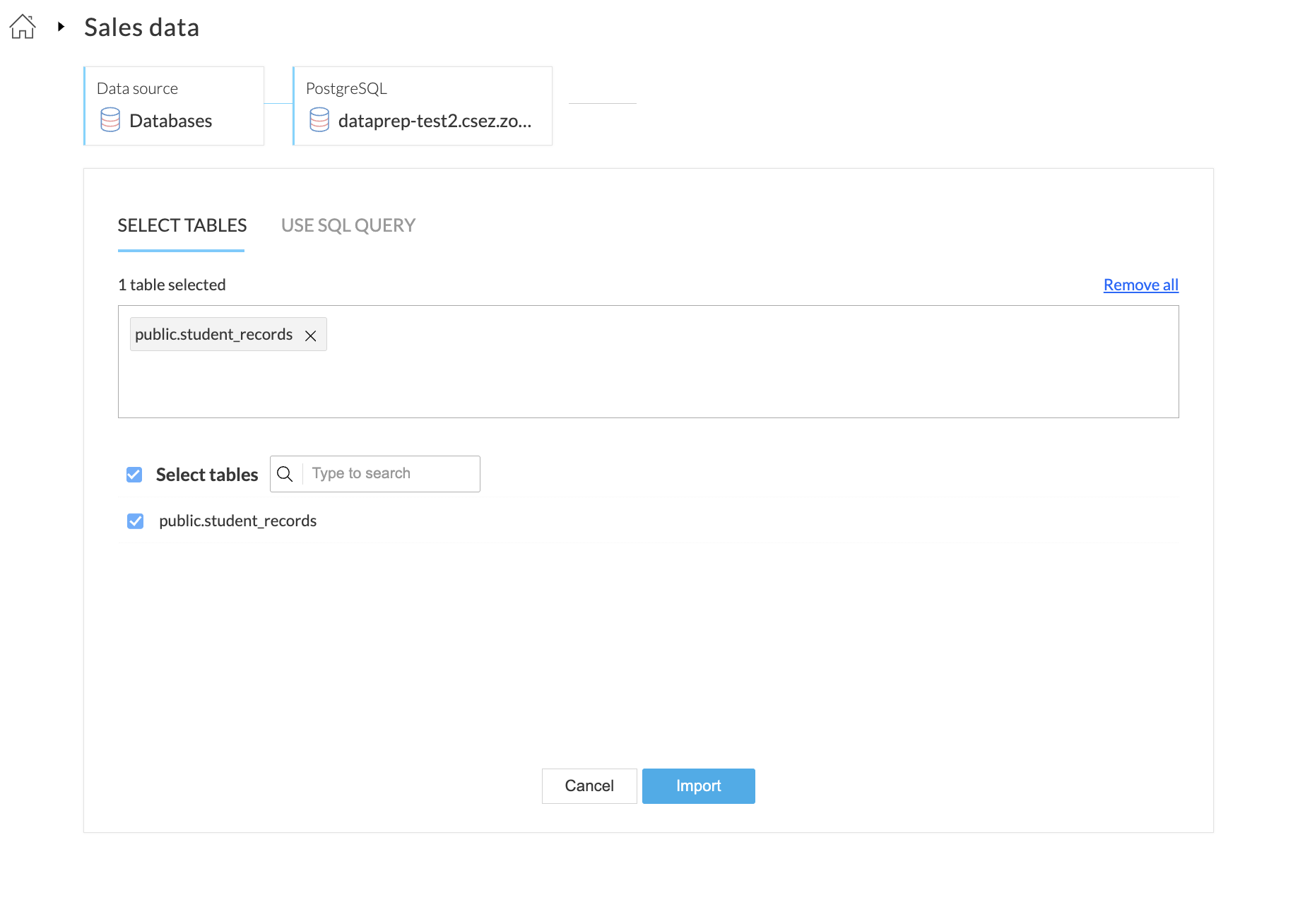 ローカルデータベースからデータをインポートする際、テーブルを選択 オプションを使用すると、下記のインポート設定でローカルデータベースからのインポート方法や増分データの取得方法を設定できます。インポート設定です。