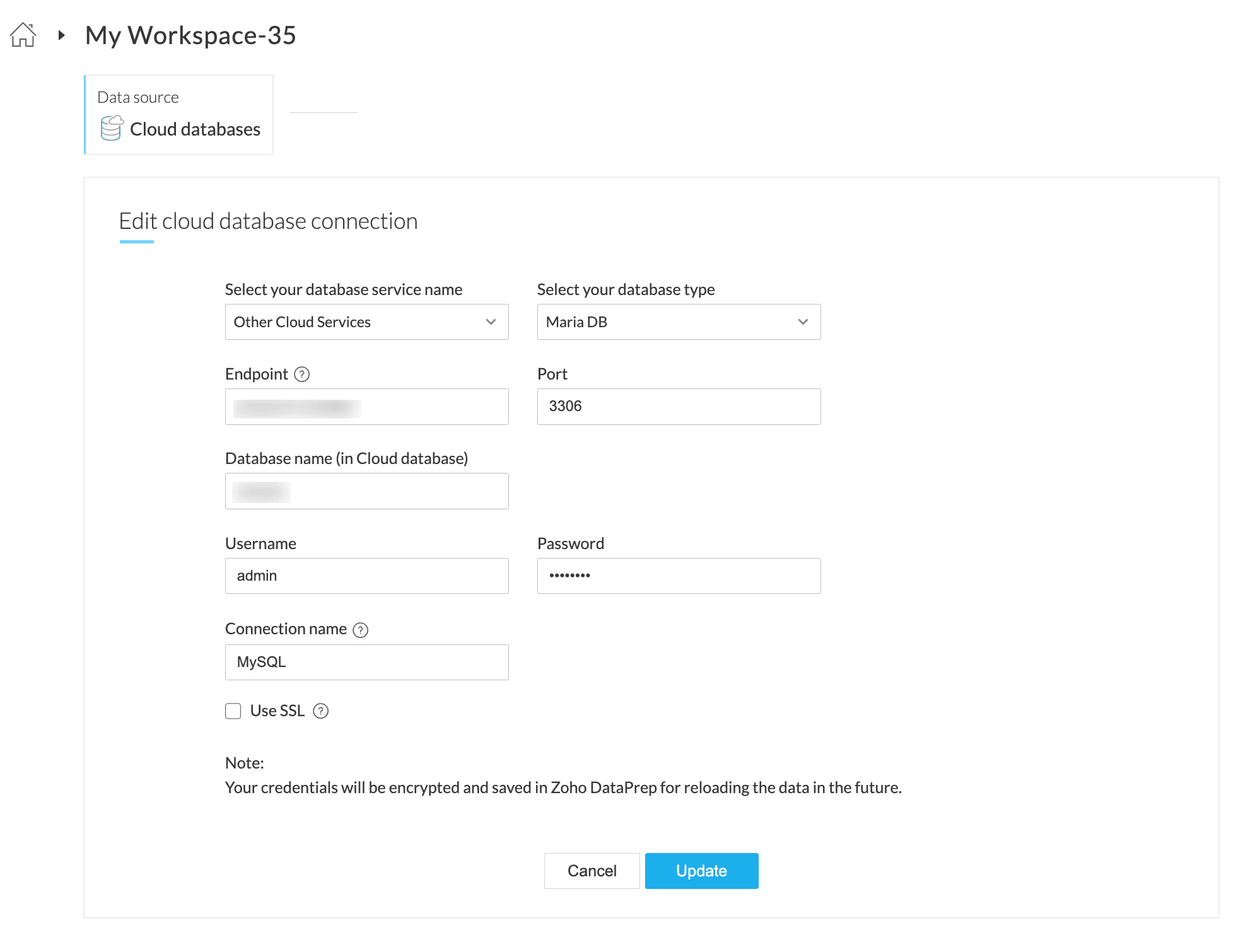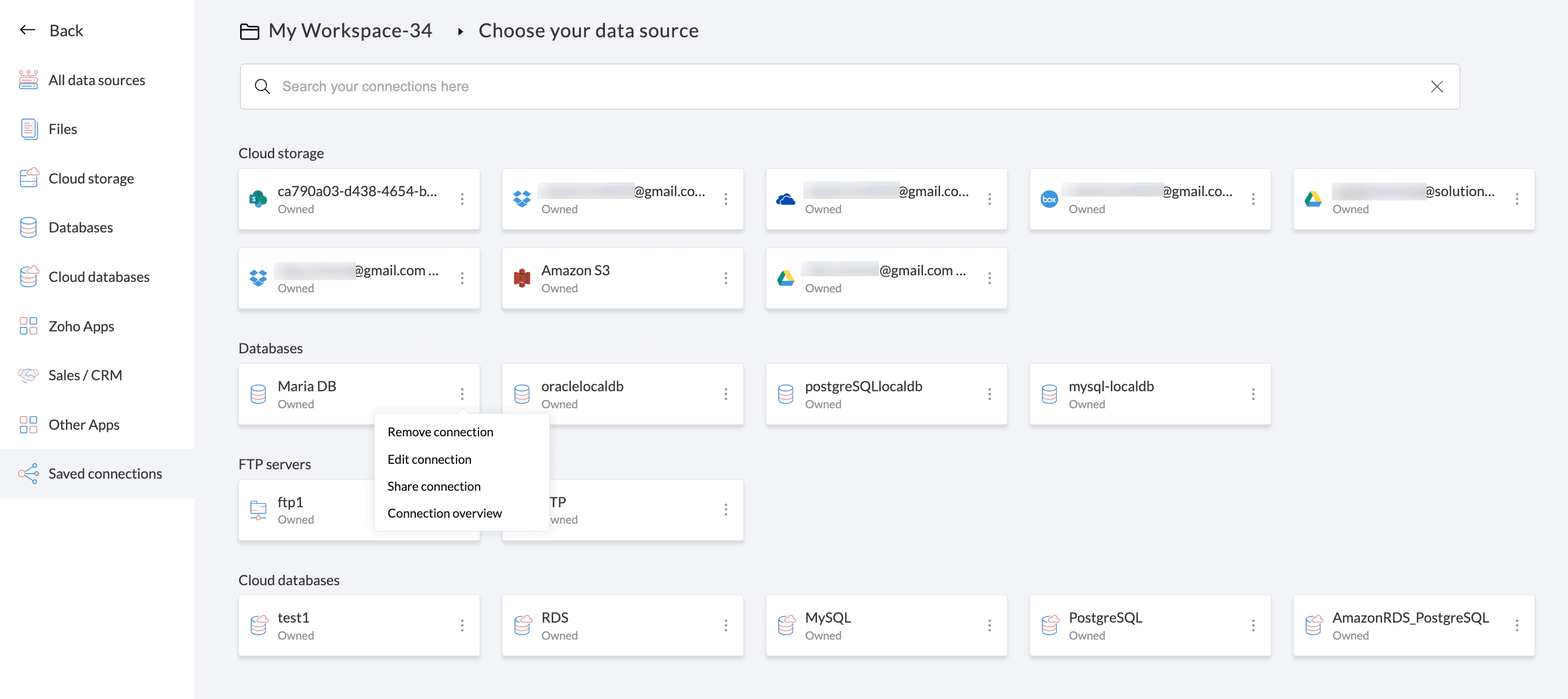 3. 編集 connection オプションをクリックして、保存済み接続を新しいパラメーターや認証情報で更新します。