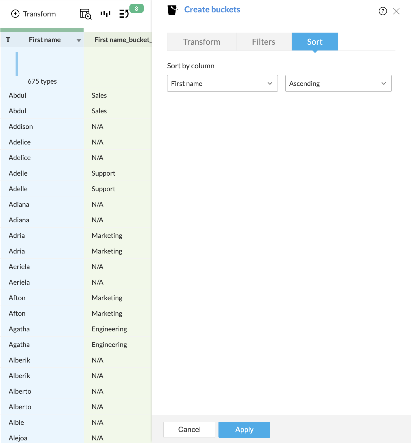 テキスト列でバケッティングを適用する手順: