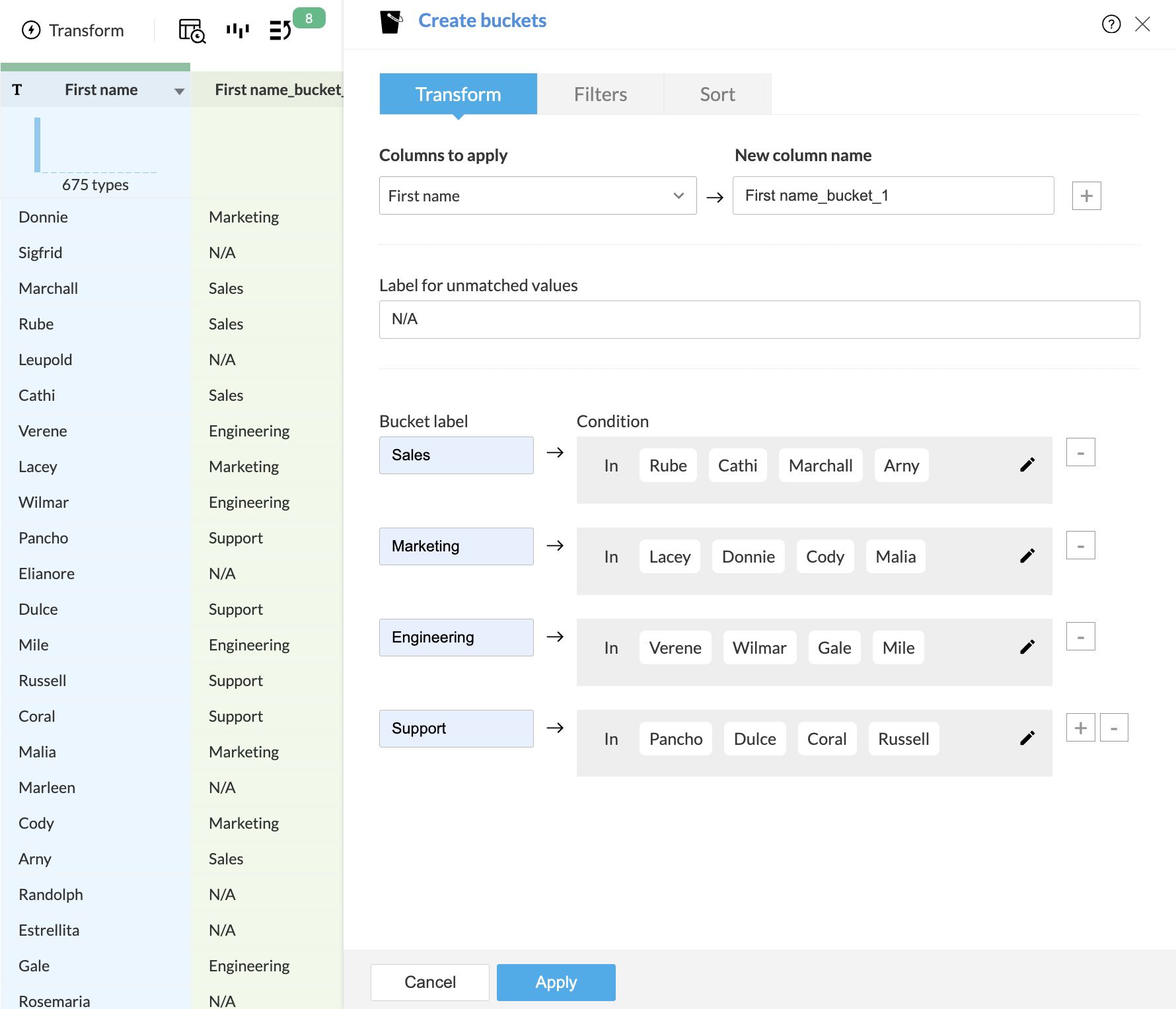 値が(Weber, Tandy, Hallsy )に含まれる場合、バケット「マーケティング」に追加