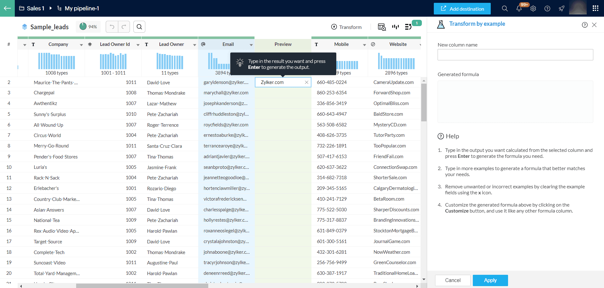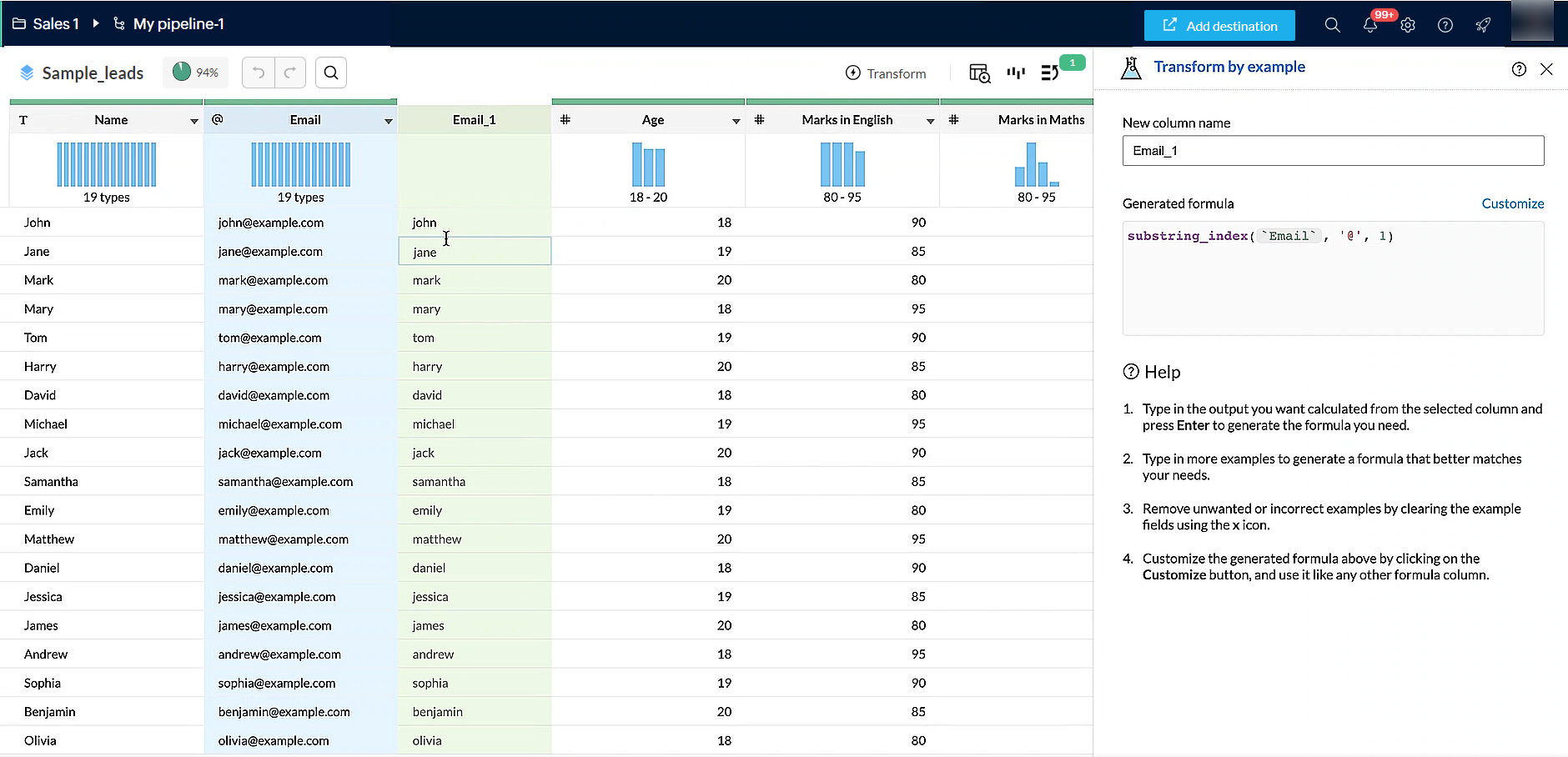 b) メールアドレス列から名前だけを抽出したい場合、値「john」を例として入力するだけで、 DataPrepが残りの列も必要な出力で自動的に埋めます。作成済み数式と出力のスナップショットはこちらです。
