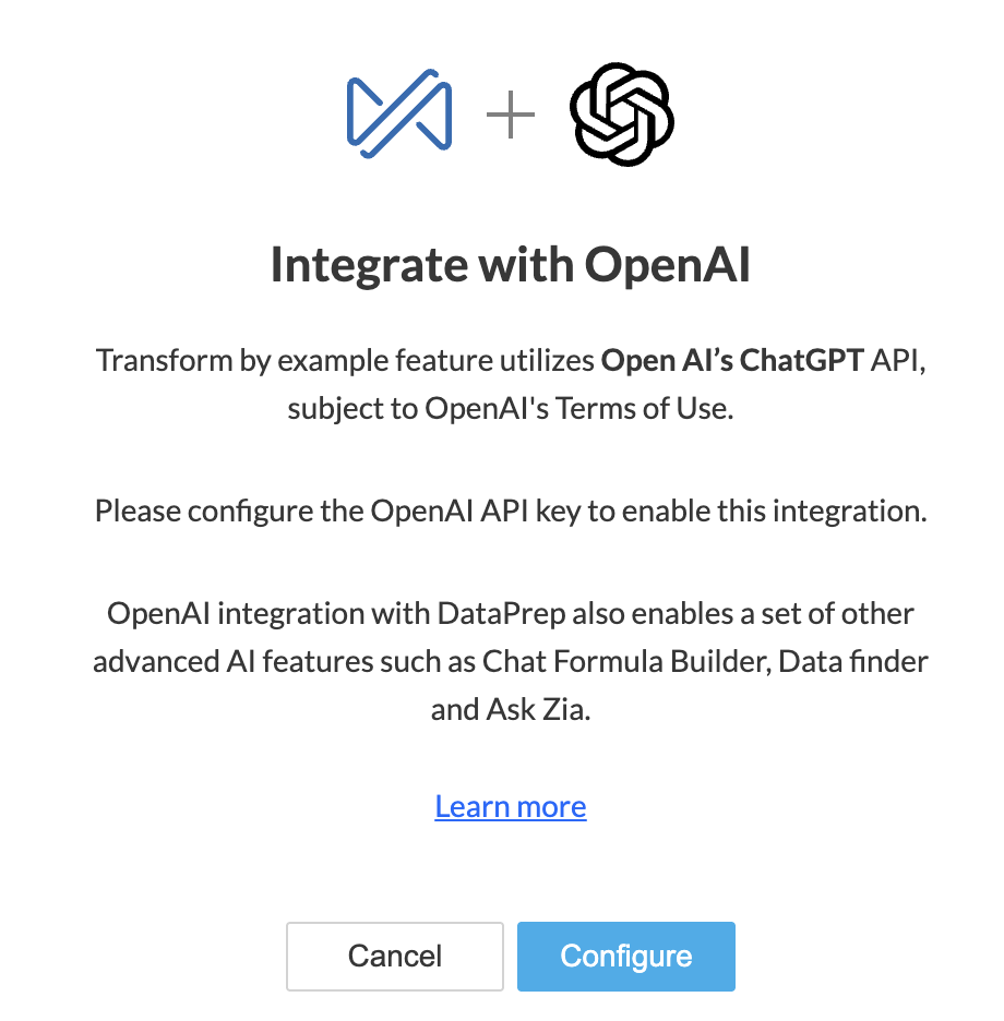 Info データプライバシーに関するお知らせ: Zoho DataPrepは、米国に拠点を置く外部サービスであるOpenAIのChatGPT APIを利用しており、OpenAIの利用規約が適用されます。送信される情報は、ユーザーであるお客様が提供するアクセス権に依存します。ChatGPTに共有されるデータは、有効化した機能に基づきます。列名や選択したセルデータなどの詳細情報は、各機能に応じて共有されます。共有したいデータのレベルに応じて、各機能を有効または無効にすることが可能です。そのため、このサービスのご利用時には慎重にご判断いただき、提供するデータに機密情報や個人情報が含まれないようご注意ください。