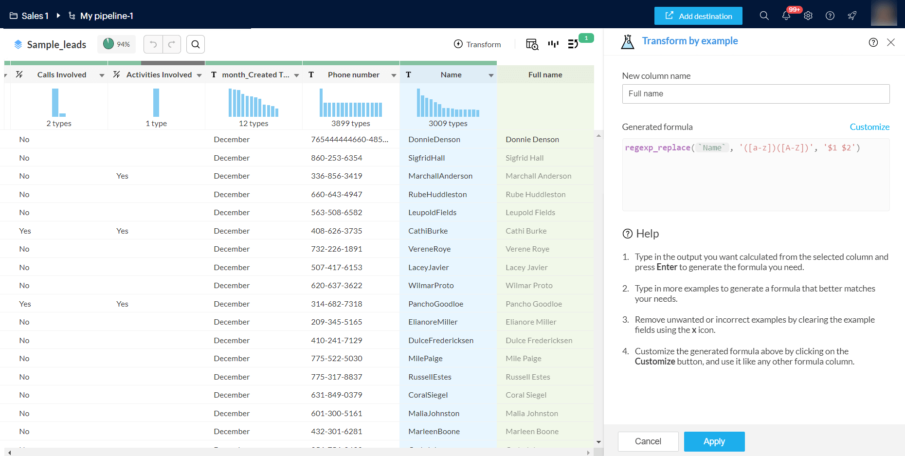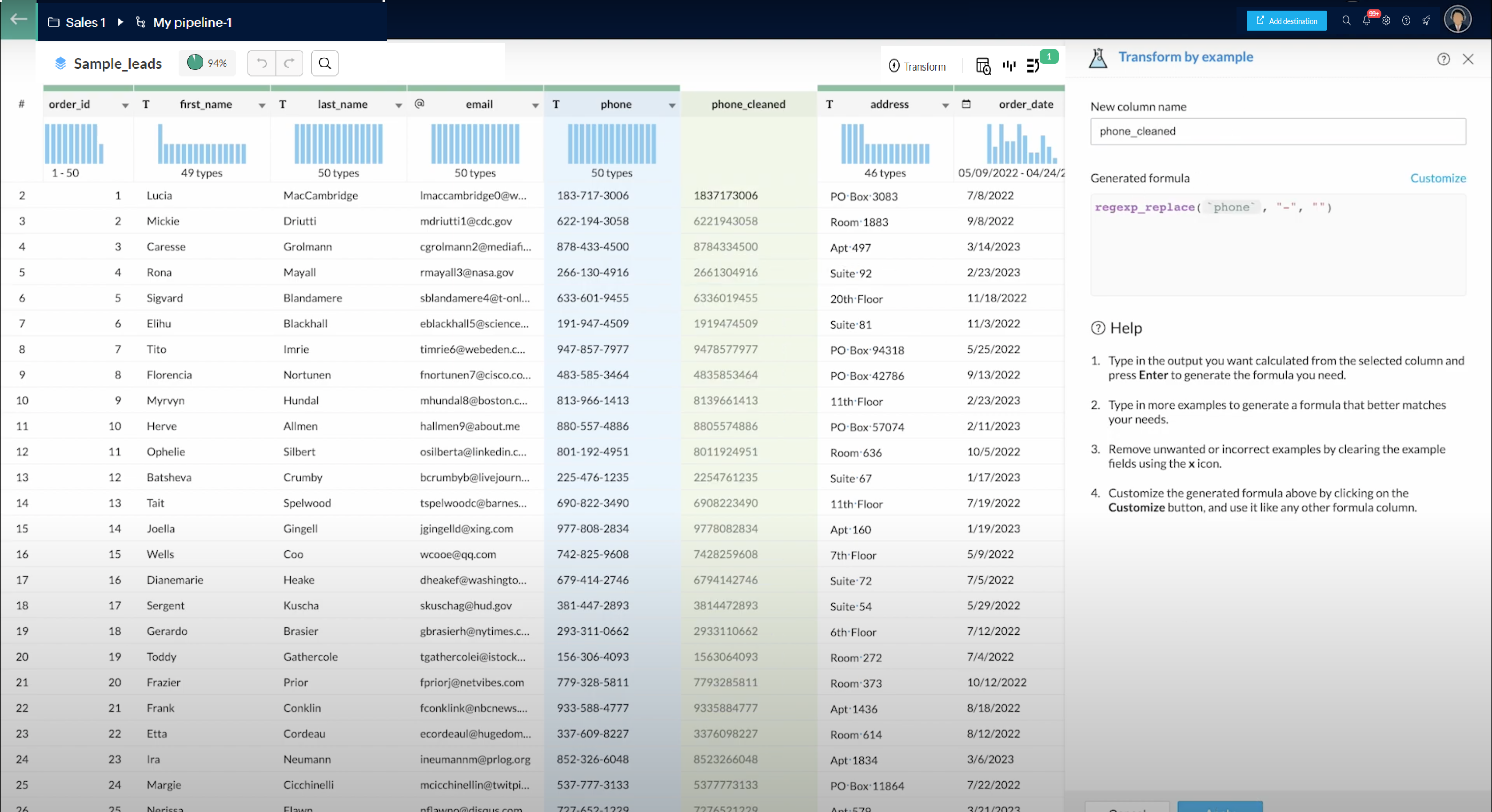 5. すべての値で作成済み出力がご要件と一致しない場合は、別の例を入力し、Enterキーを押してください。DataPrepは新しい入力を考慮し、データ変換の新しい方法を生成します。