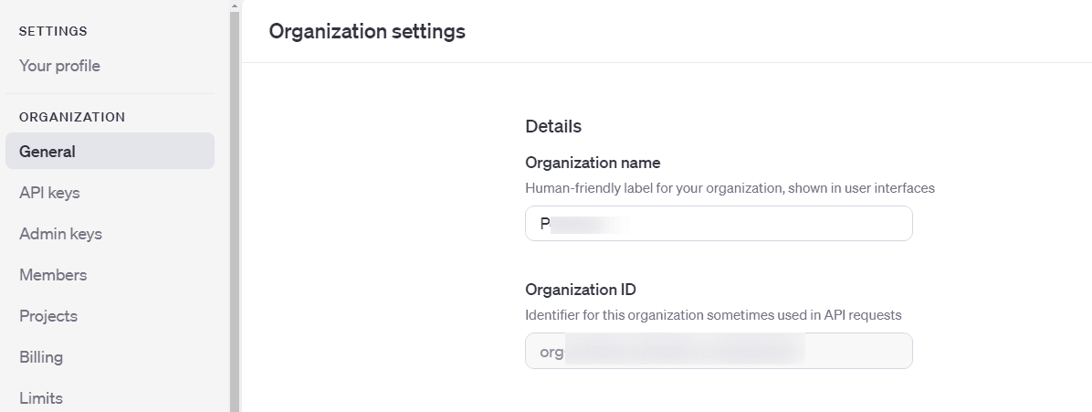 1. OpenAIの設定ページにアクセスし、組織名およびIDを確認します。下記は参考用のスナップショットです。詳細はこちら(OpenAI)