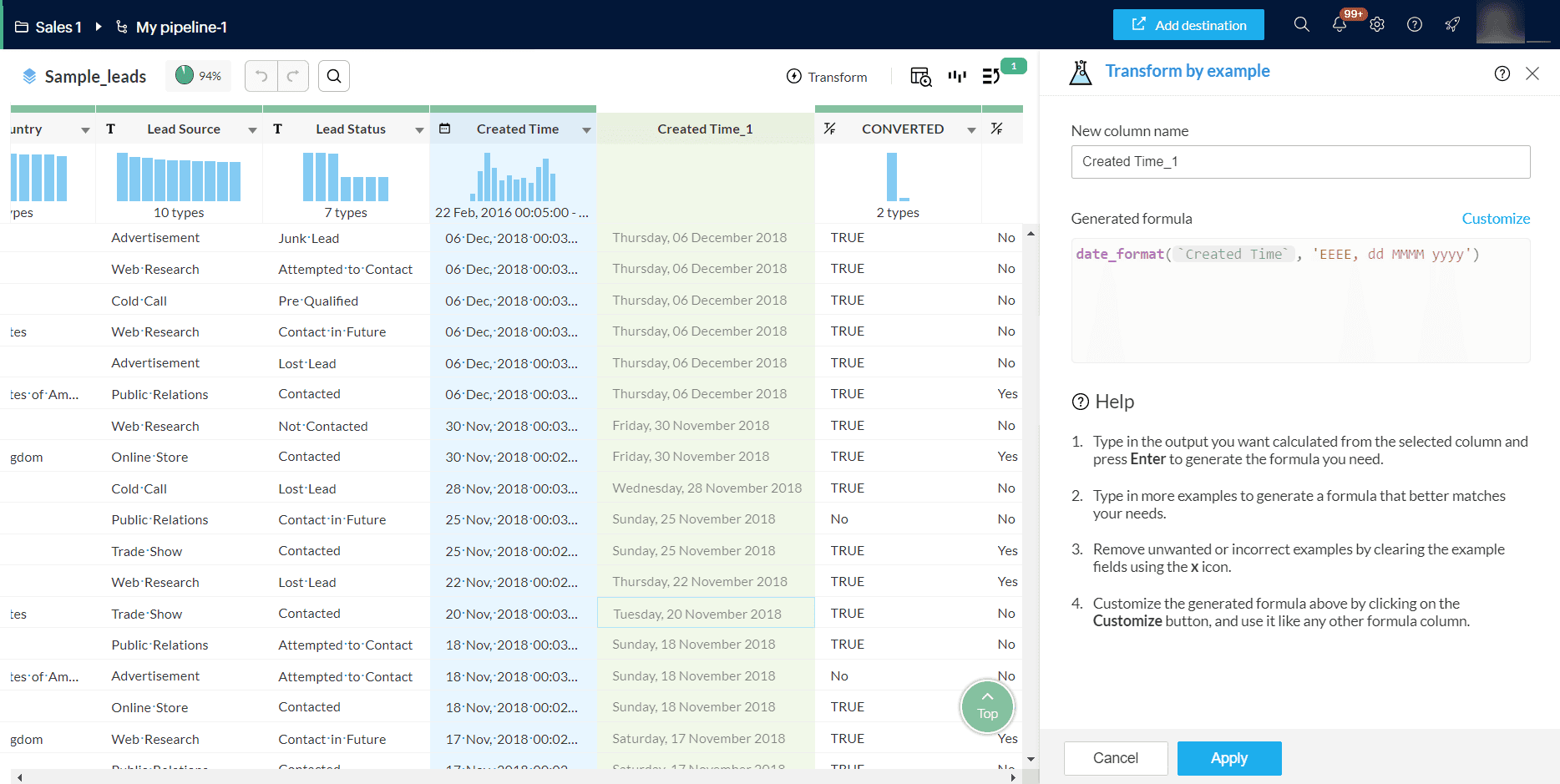 2. この操作により、例による変換パネルが数式列変換に切り替わります。これにより、数式列機能のすべての機能を利用して、ご要件に合わせて細かく調整できます。