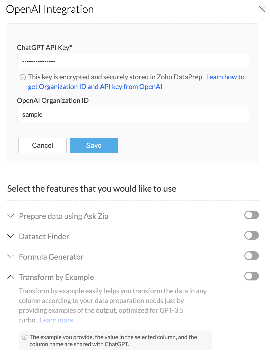 Notesメモ : 入力されたキーは暗号化され、Zoho DataPrepに安全に保存されます。OpenAIから組織IDとAPIキーを取得する方法はこちら