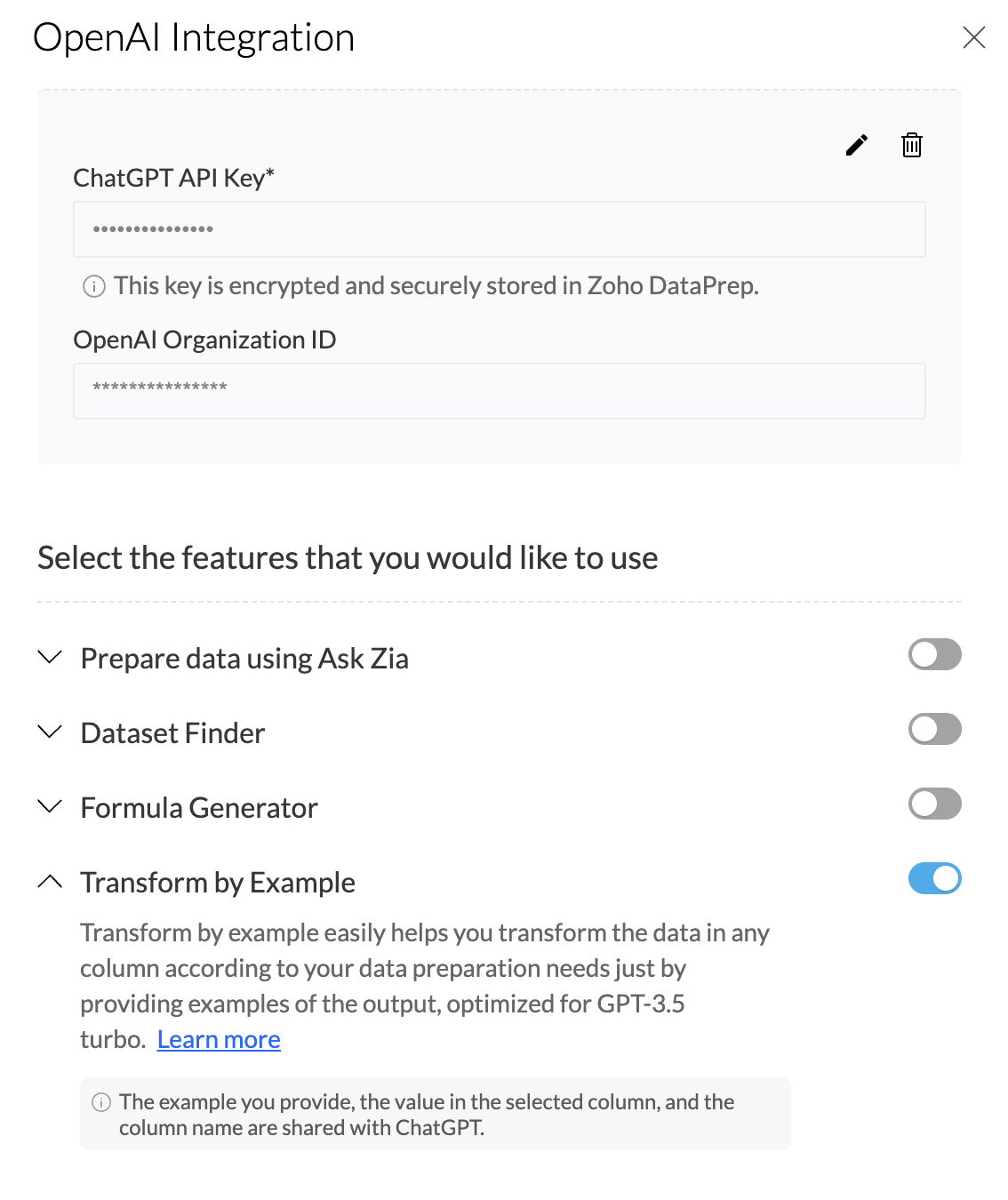Zoho DataPrepは、OpenAIによって開発された生成型人工知能であるChatGPT APIとの連携により、例に基づく入力で列の変換を支援します。この機能をDataPrep組織で有効にするには、設定ページのOpenAI Integrationタブに移動してください。こちらをクリックすると、OpenAI連携機能の有効化について詳しくご覧いただけます。
