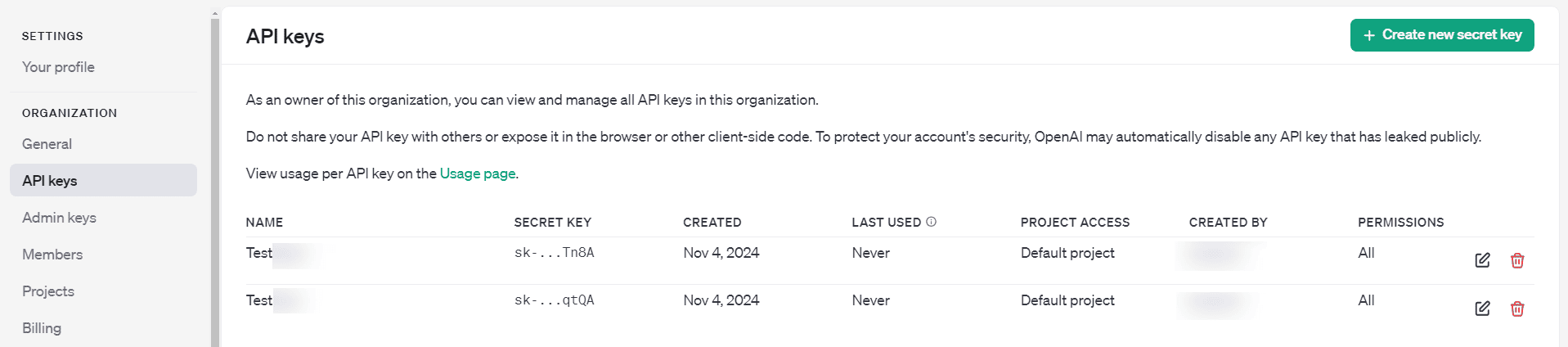2. 組織セクションのAPI keysタブに移動して、APIキーを取得します。下記は参考用のスナップショットです。詳細はこちら(OpenAI)