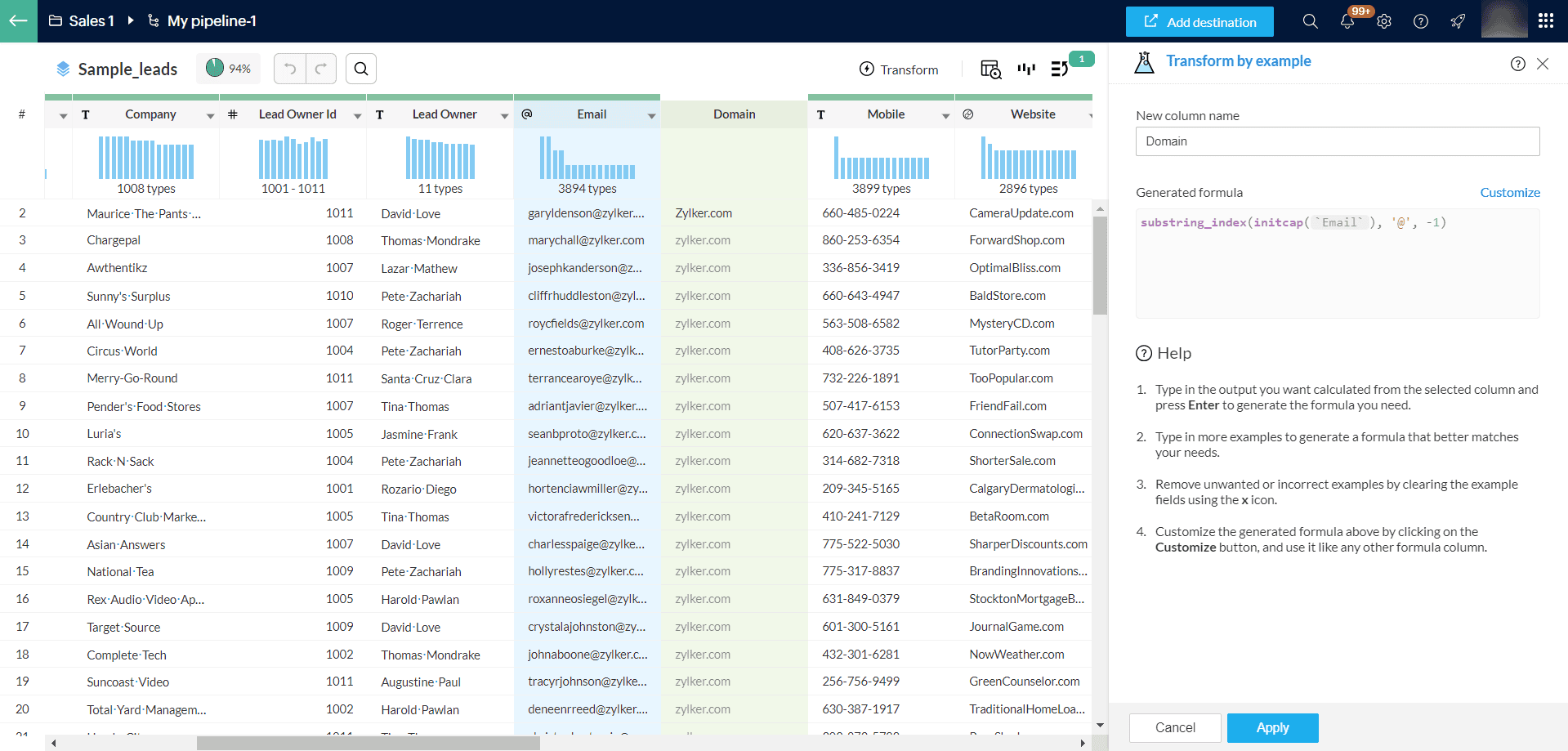 お知らせ:当社は、お客様により充実したサポート情報を迅速に提供するため、本ページのコンテンツは機械翻訳を用いて日本語に翻訳しています。正確かつ最新のサポート情報をご覧いただくには、本内容の英語版を参照してください。 新しい columns を作成し、Formula 列変換を使ってカスタマイズできます。Zoho DataPrep では、さまざまなニーズに対応する多彩な関数を提供しています。関数の詳細については、こちらをクリックしてください。 Formula 列の作成方法 1. Transform ...