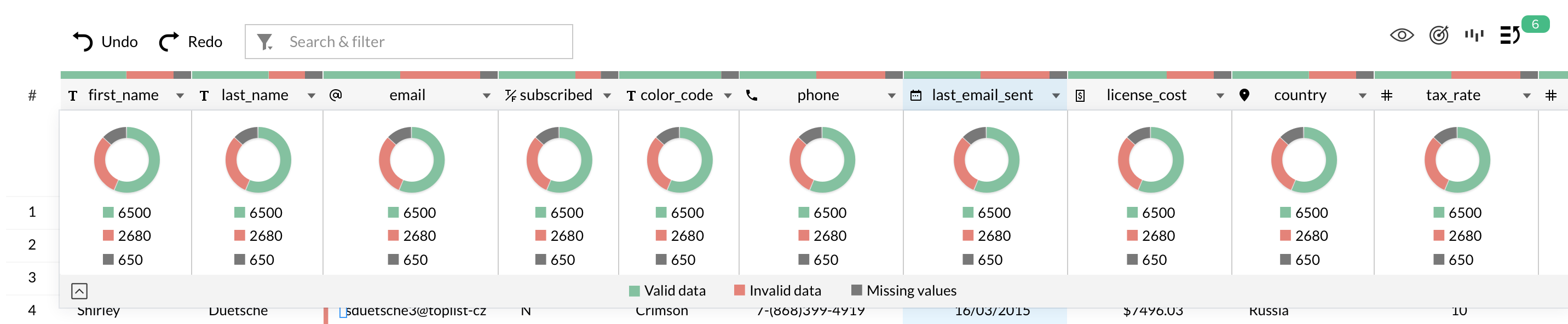ドーナツチャートは、有効なデータ、無効なデータ、欠損値を割合(%)で分けて表示します。ドーナツチャートの各セクションをクリックすると、有効・無効・欠損値のみをデータ内で個別に表示できます。
