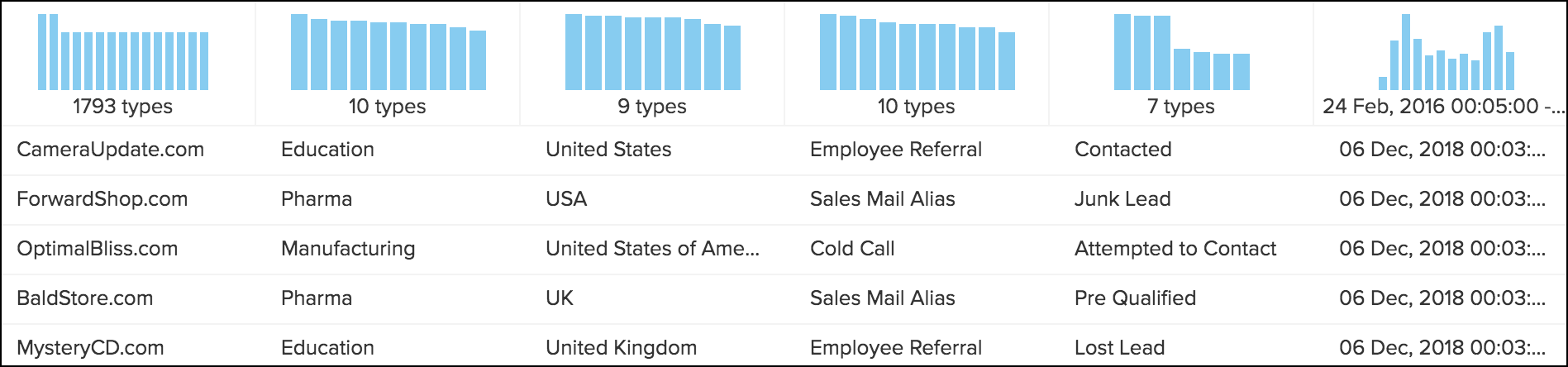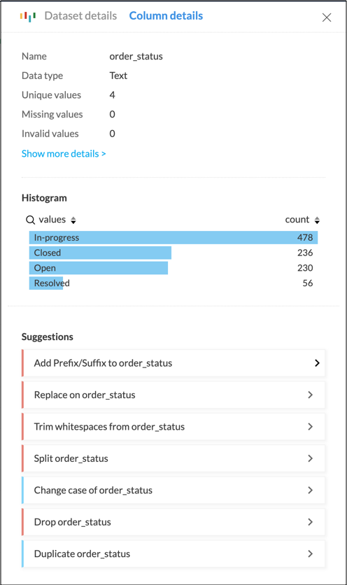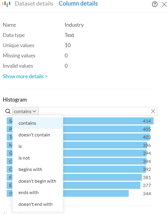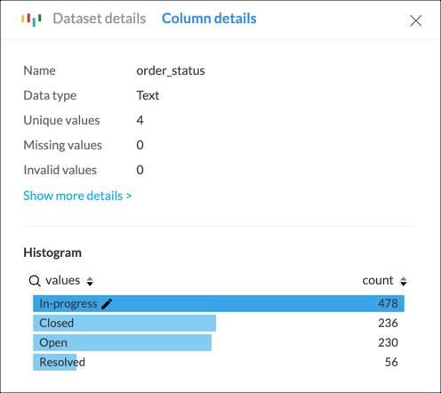 このヒストグラムの詳細バージョンは、列を選択した際に下部に表示される「列詳細」にも表示されます。