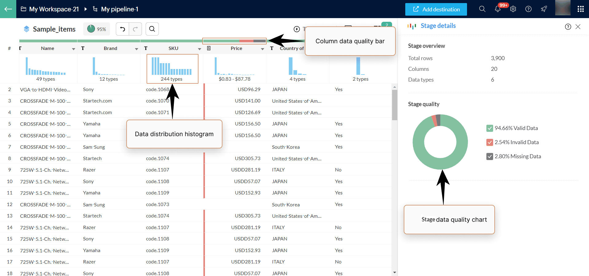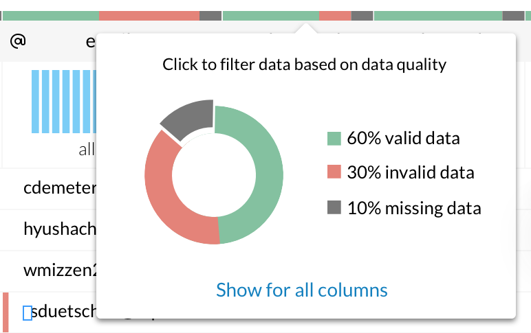 - データ品質棒グラフにカーソルを合わせると、列のデータ品質をすばやく確認できます。