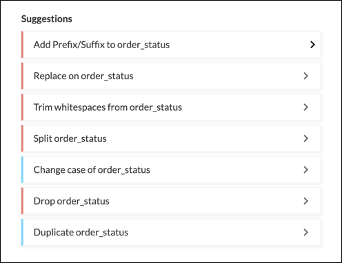 DataPrepは、インポートされたデータに基づいて適切な変換方法を提案します。提案は、1列または複数列が選択されている場合や、フィルターが適用された時に表示されます。