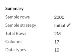 サンプルを生成することで、変換処理の高速化が図れます。これは、全データからさまざまな戦略を使ってサンプルを抽出することを意味します。初期サンプル 戦略は、初めてデータをインポートした際に使用されます。データ準備プロセスの途中でも、戦略はいつでも変更可能です。サンプル戦略を変更するには、Stage 詳細パネル内の編集アイコンをクリックしてください。
