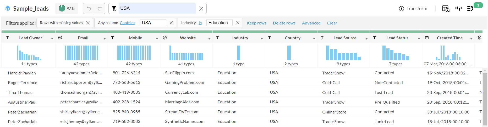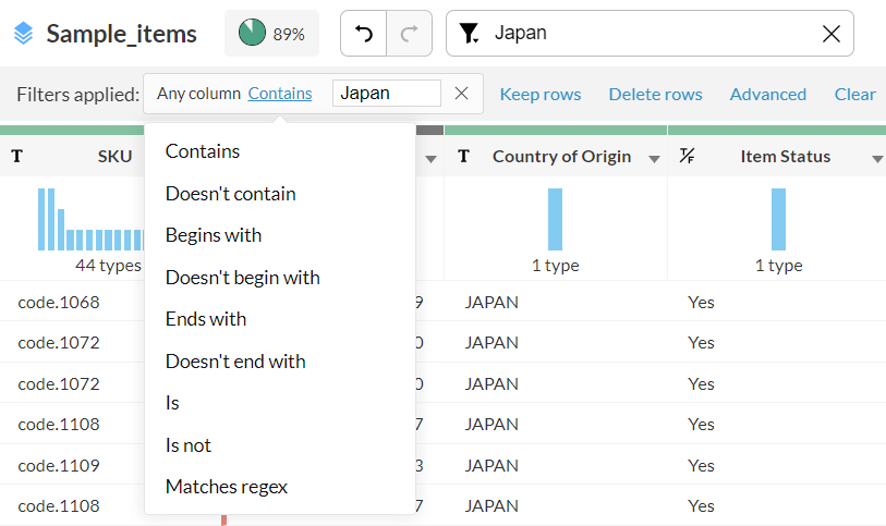 セクションをクリックすると、DataPrepが該当する行のみをフィルターし、無効データや欠損値のあるデータを簡単に確認・対応できます。