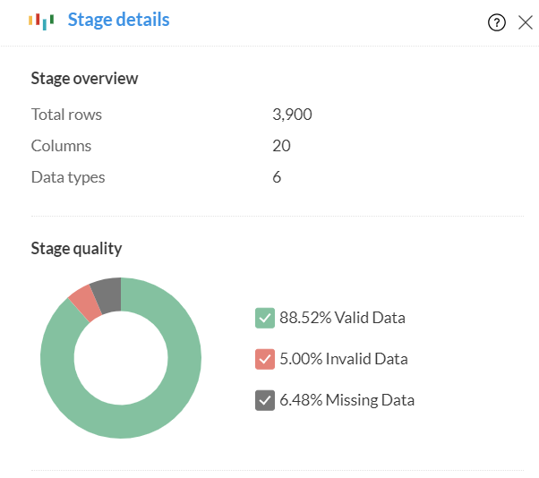 Stage 詳細では、ドーナツチャートを使ってステージ全体のデータ品質を表示します。この数値は、各列の品質を集計して算出されます。このセクションは、ステージがデータ準備画面に読み込まれた際や、いずれの列も選択されていない時に初めて表示されます。