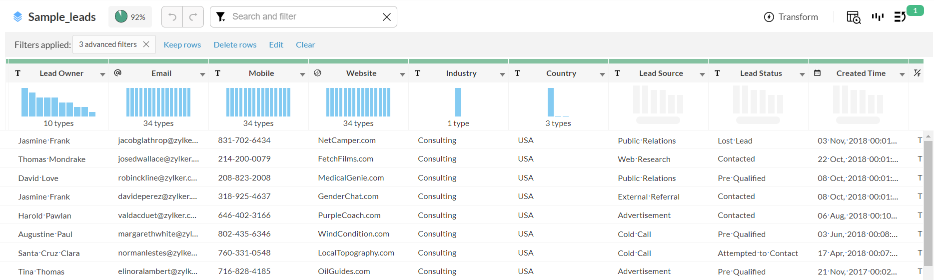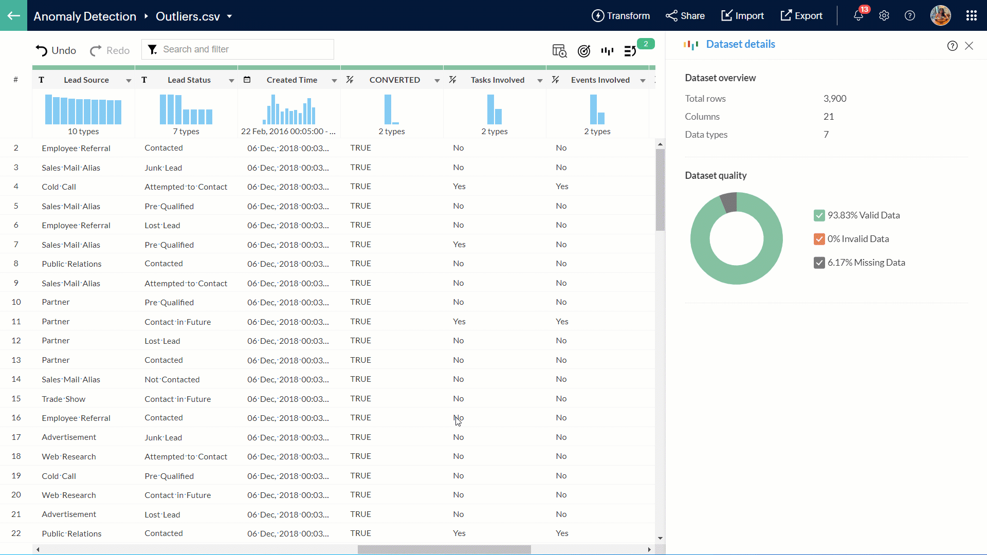 - Zoho DataPrepは機械学習技術を活用してデータの異常値を特定します。これにより、ユーザーはデータパイプライン内の異常値を管理できます。データから異常値を保持するか削除するか、ユーザー自身で決定可能です。以下のGIFは、DataPrepの外れ値検出機能を示しています。