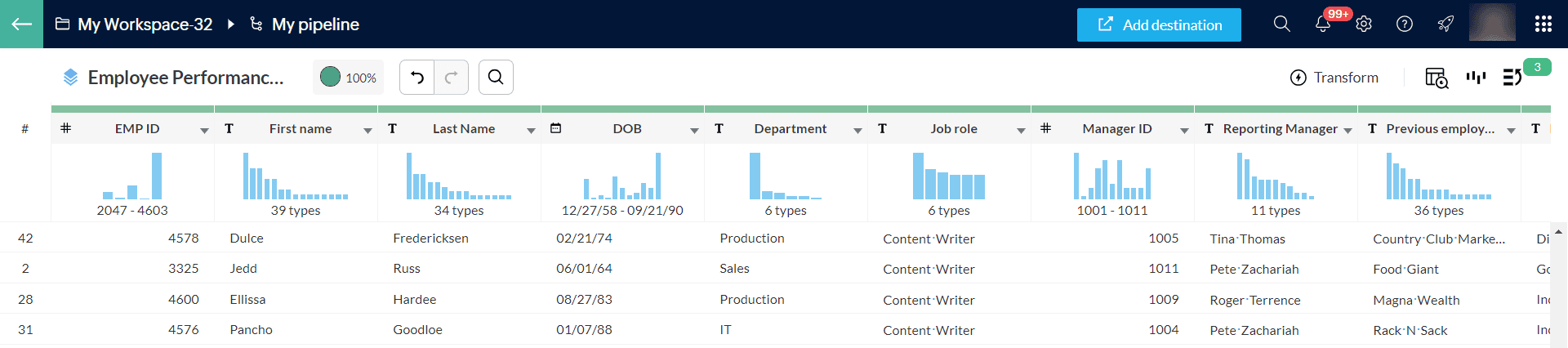 メモ:ステージの最初の100行が処理され、データの種類が提案されます。