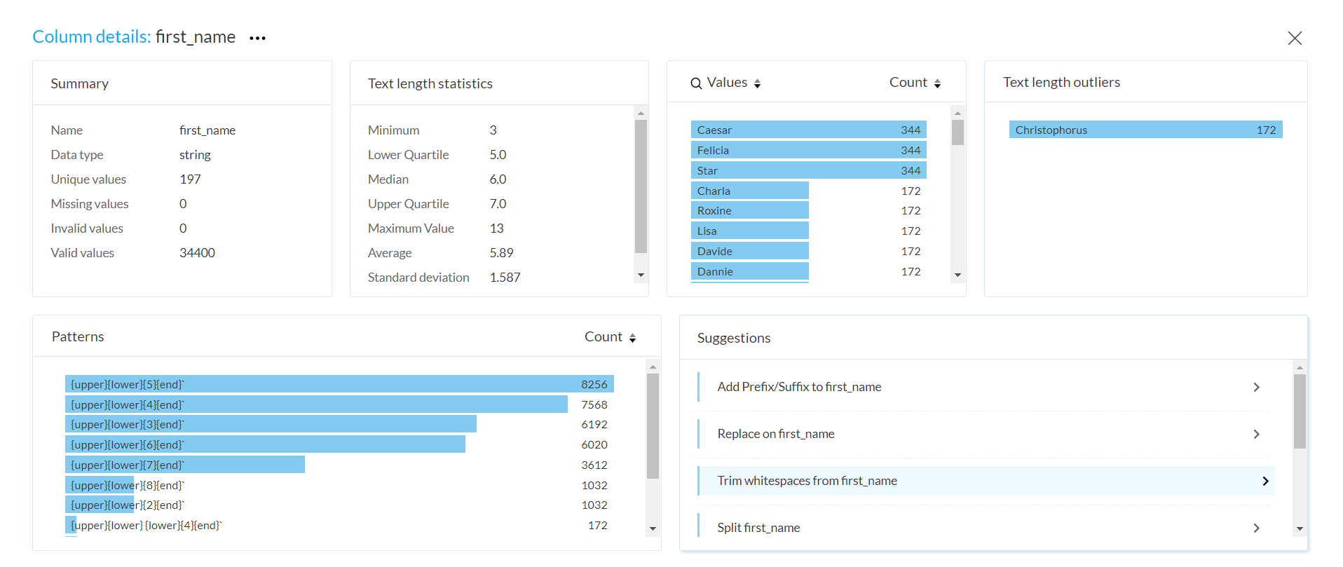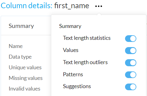 - その他の詳細を表示リンクをクリックすると、選択した列の詳細情報を拡大表示で確認できます。このセクションでは、統計情報、外れ値、ユニーク値、データパターンなど、列のさまざまな側面が表示されます。