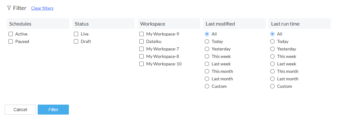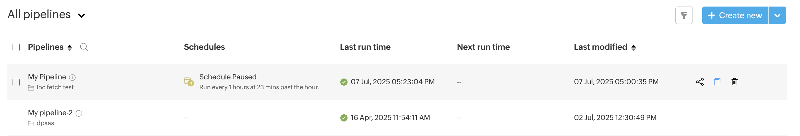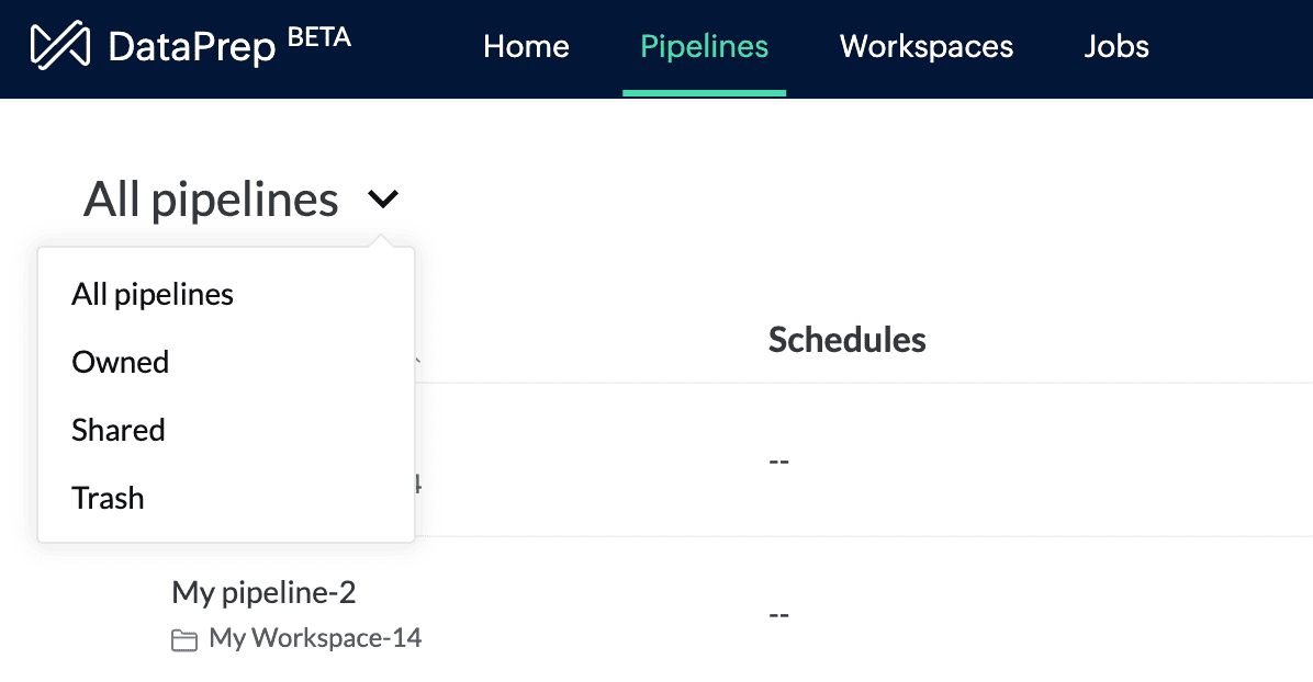 スケジュールステータス、パイプラインステータス、ワークスペース名、関連付け済みワークスペース、最終更新日、最終実行時間などの属性を使って、パイプラインをフィルターや検索が可能です。パイプラインステータスについてはこちらをご覧ください。