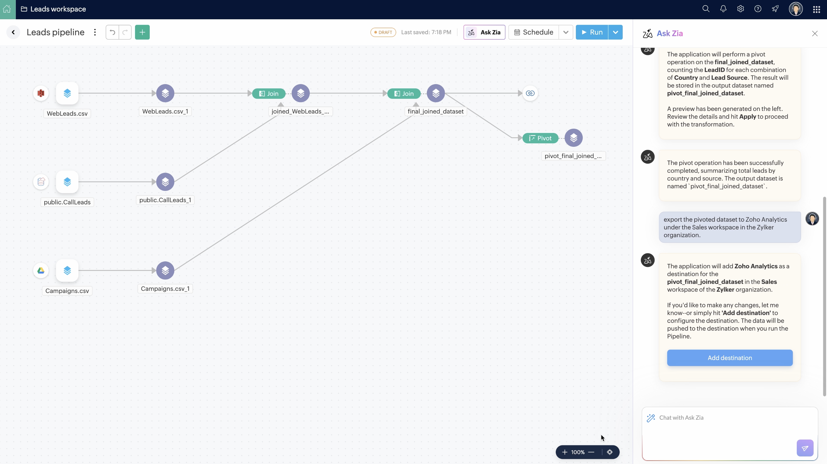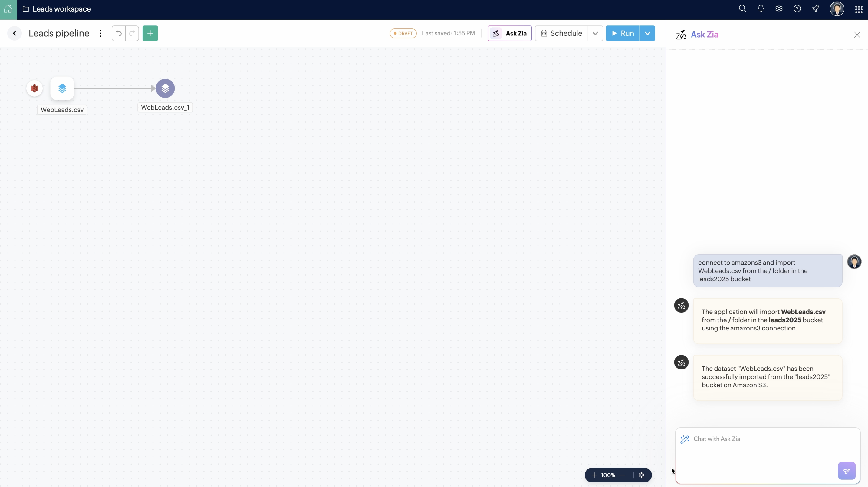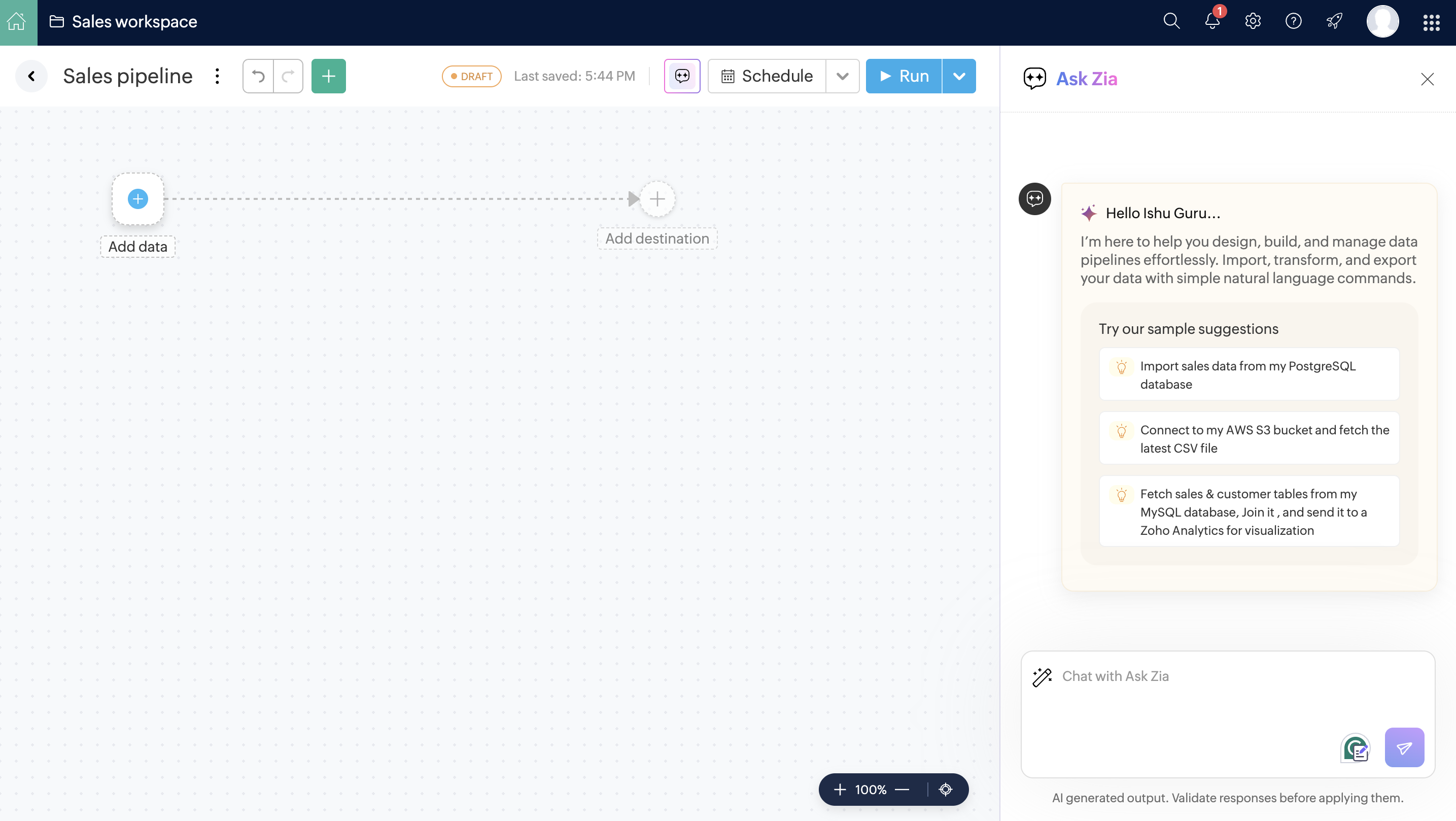 Ask-ZiaをPipeline Builderで利用することで、さまざまなソースからデータをインポートし、変換を適用し、異なる宛先へエクスポートできます。また、Ask-Ziaを使ってパイプラインのスケジューリングも可能です。