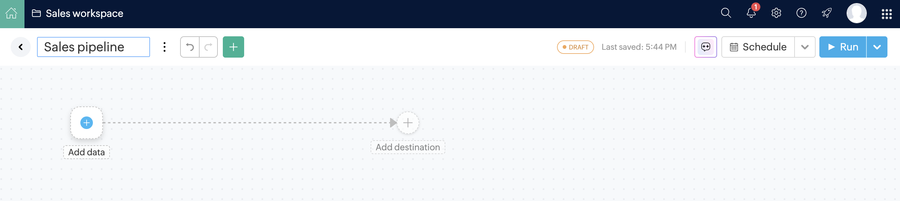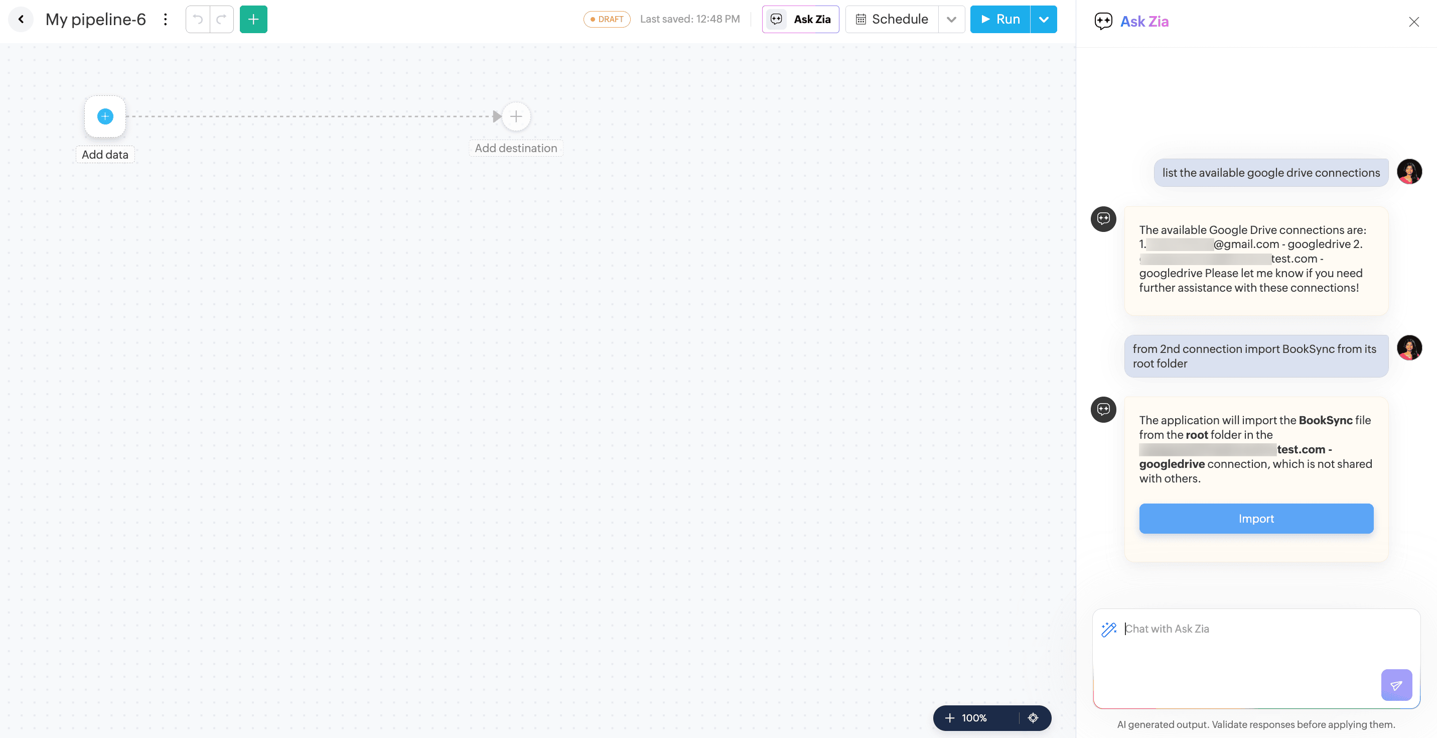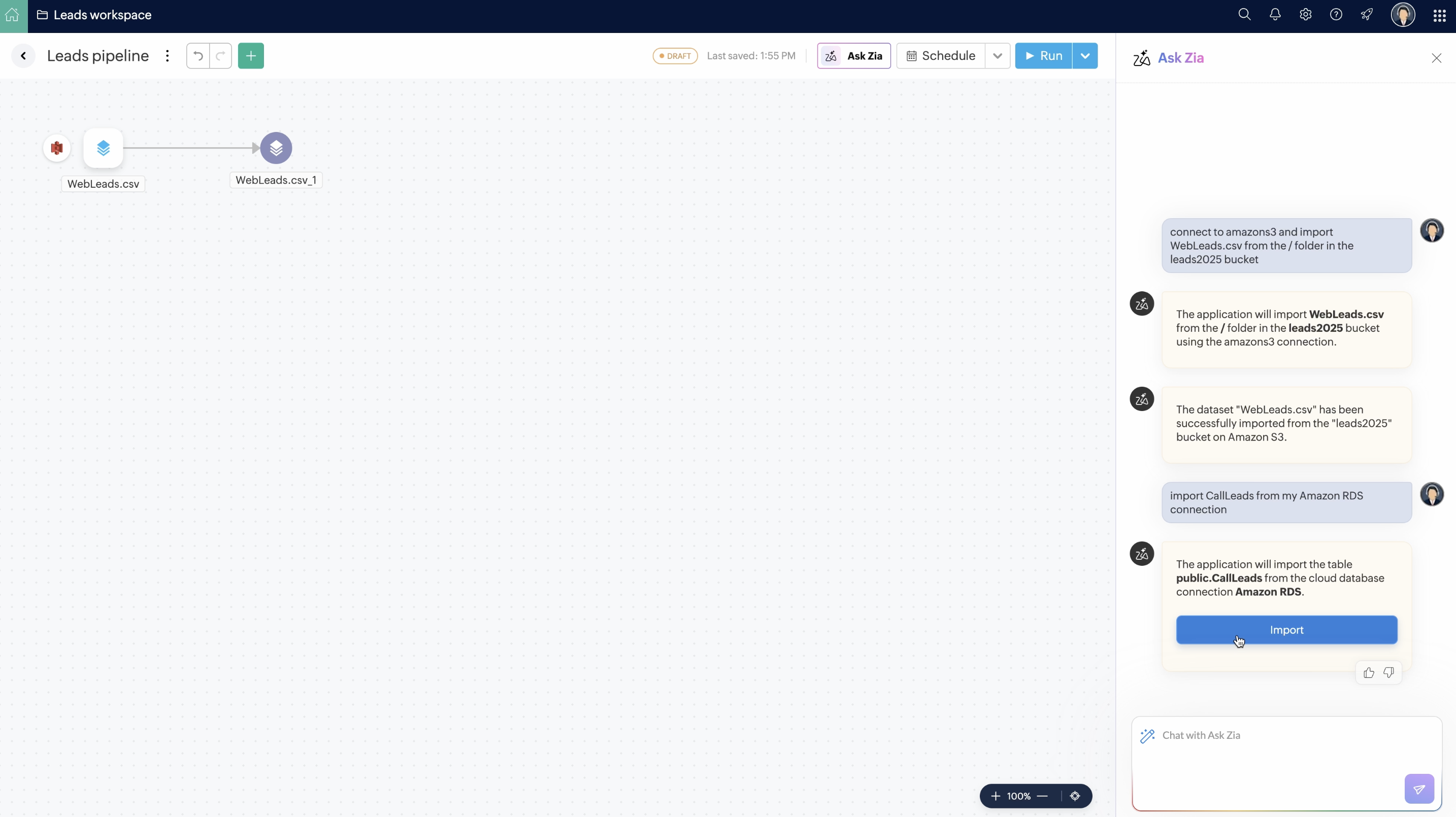 Ask-ZiaをPipeline Builderで利用することで、さまざまなソースからデータをインポートし、変換を適用し、異なる宛先へエクスポートできます。また、Ask-Ziaを使ってパイプラインのスケジューリングも可能です。