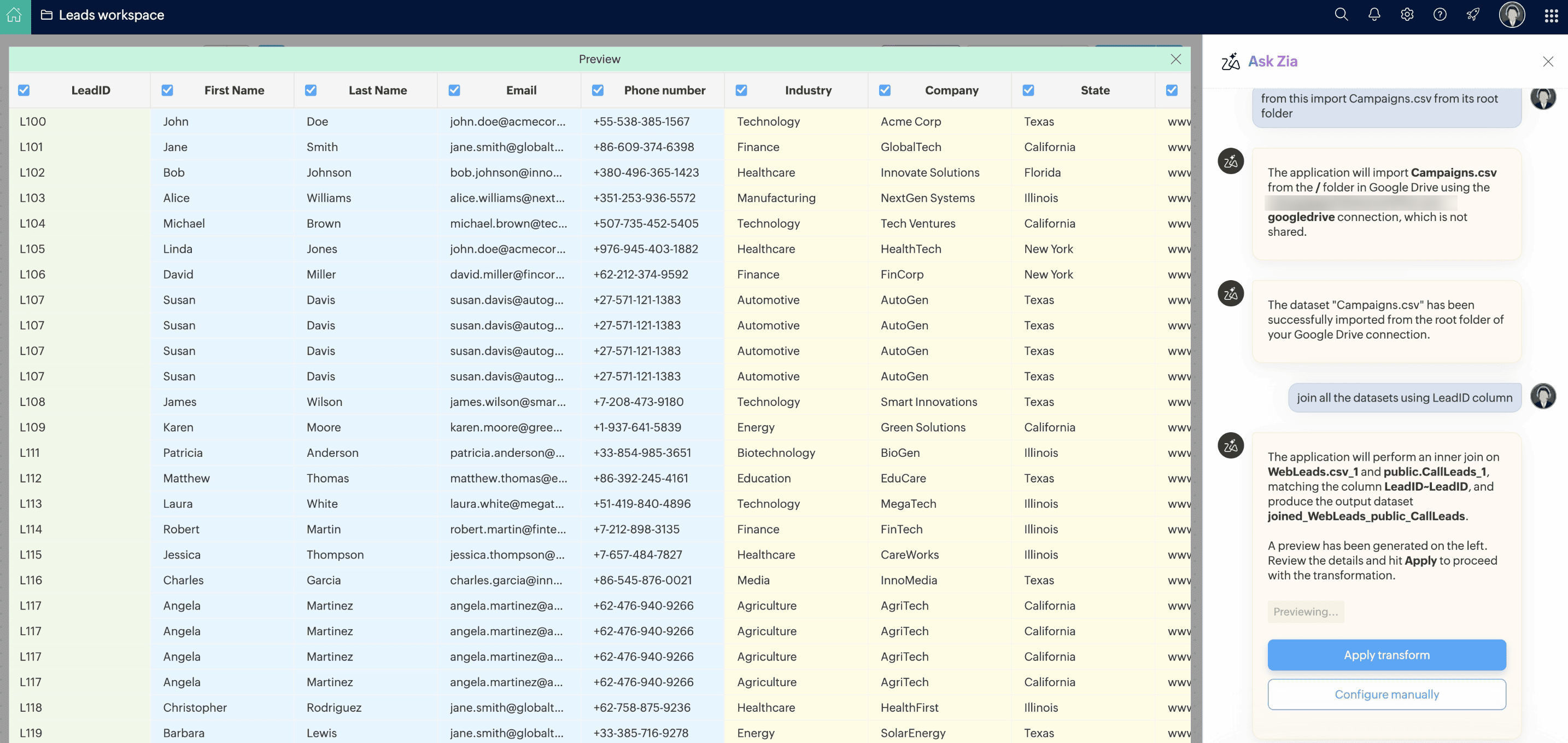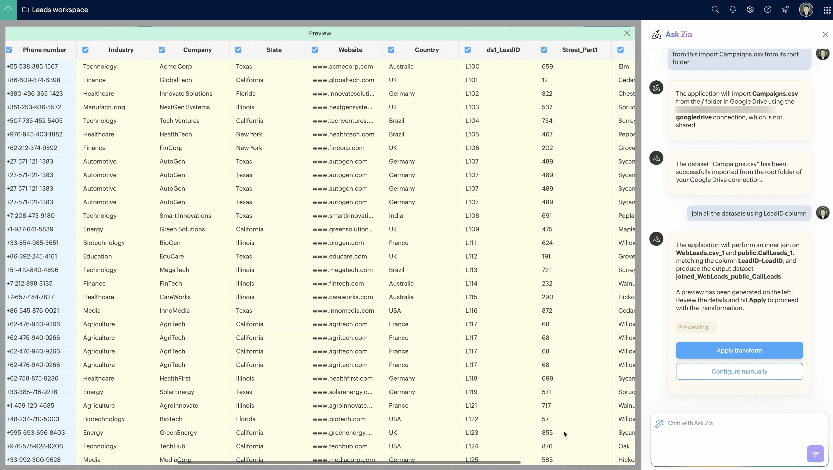 4. インポートした3つの見込み客データセットを、主キー列「LeadID」を基準に結合して統合した見込み客データセットを作成します。以下はプロンプトと出力プレビューのスナップショットです。
