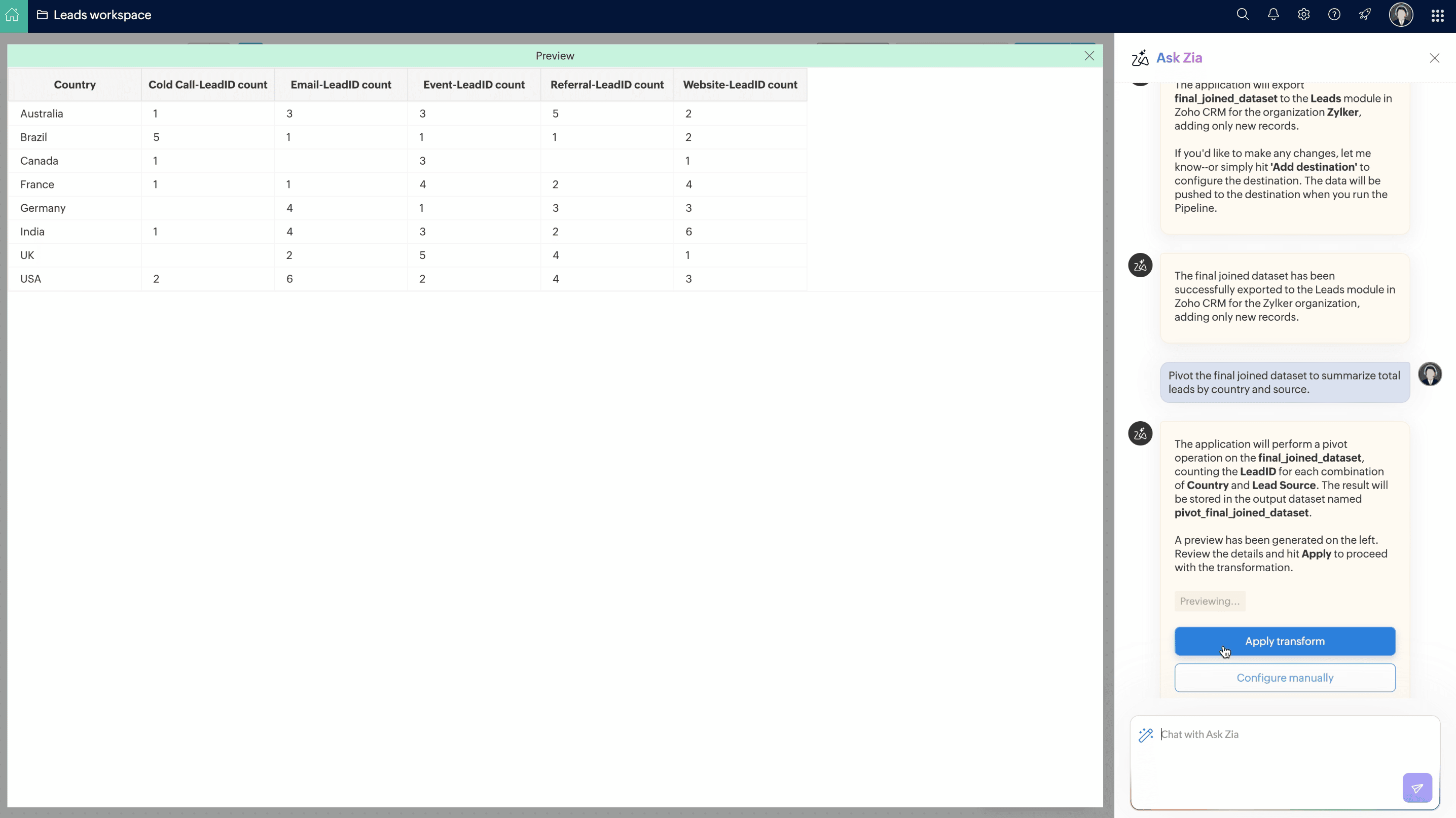 5. ピボット変換を実行し、見込み客を地域別およびデータ元別に集計します。以下はプロンプトと出力プレビューのスナップショットです。