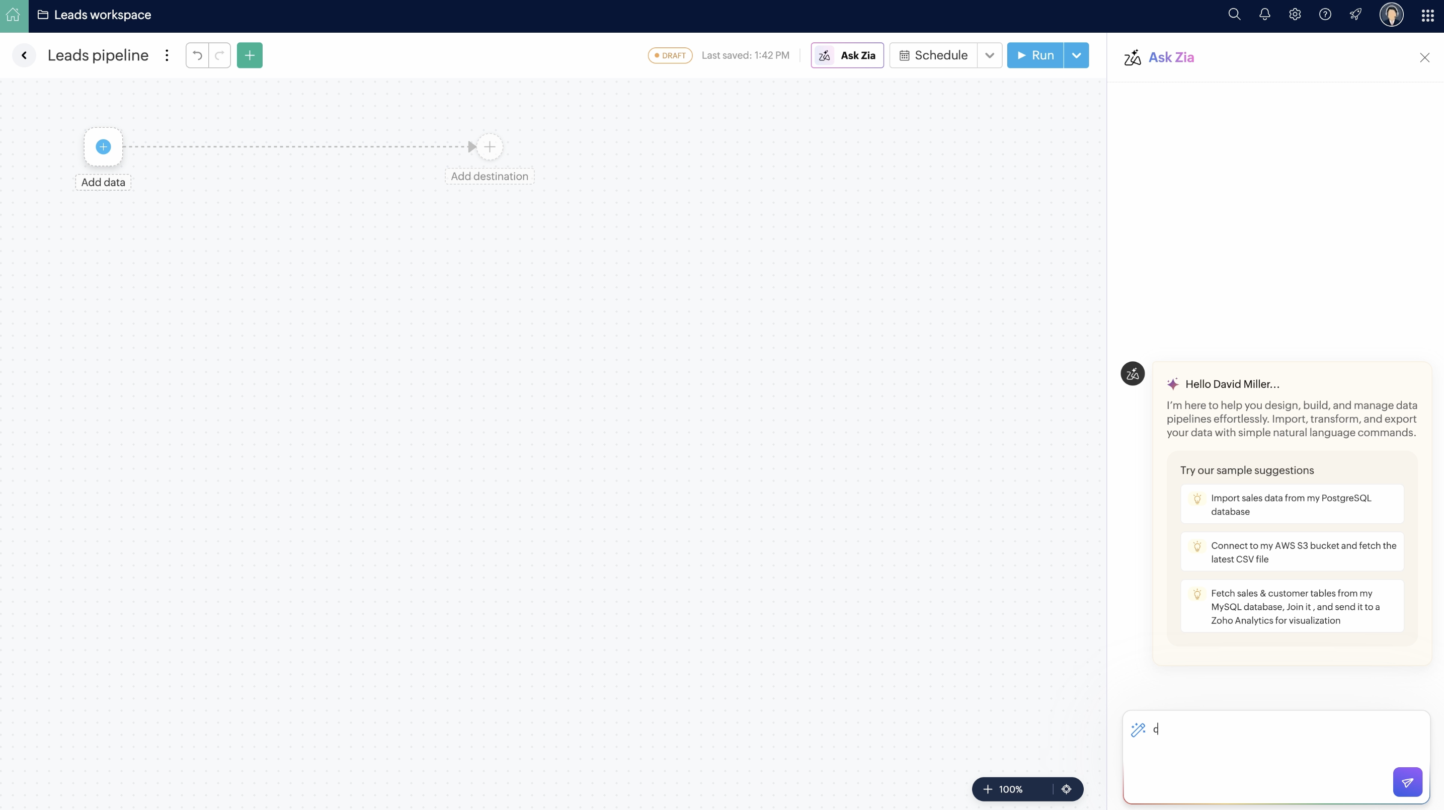 データデスティネーションは、データをエクスポートする場所です。クラウドデータベースやZoho CRM、Zoho Analyticsなどの法人アプリケーションが含まれます。DataPrepでは、50種類以上のデータデスティネーションから標準デスティネーション出力を選択し、加工済みデータをエクスポートできます。