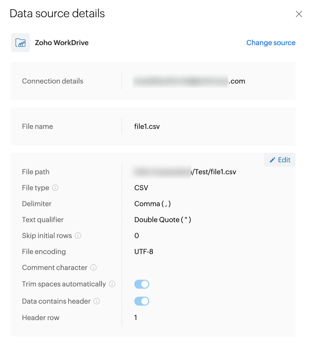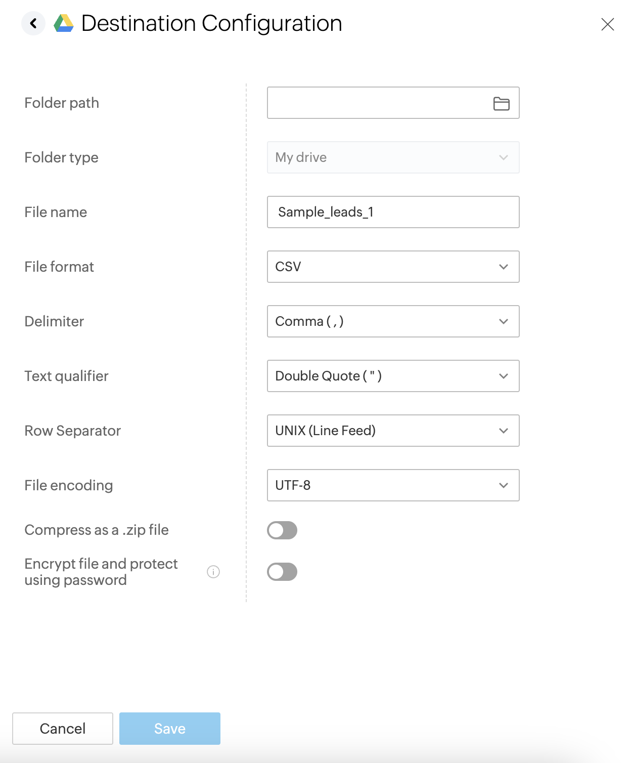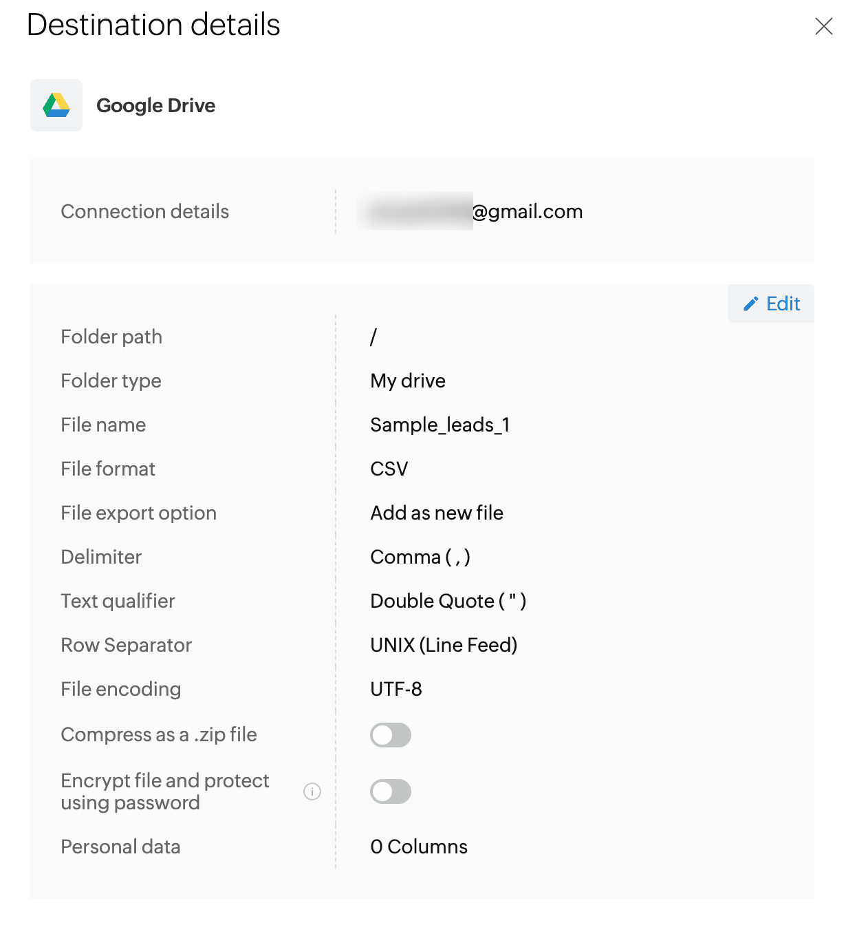 7. destination を1回クリックすると、Connection 詳細、フォルダーパス、File エクスポートオプション、ファイル名、File 形式、区切り文字、テキスト区切り文字、行区切り、ファイルエンコーディング、.郵便番号 ファイルとして圧縮、個人データなどの詳細が表示されます。編集オプションをクリックすると、destination 詳細を編集できます。