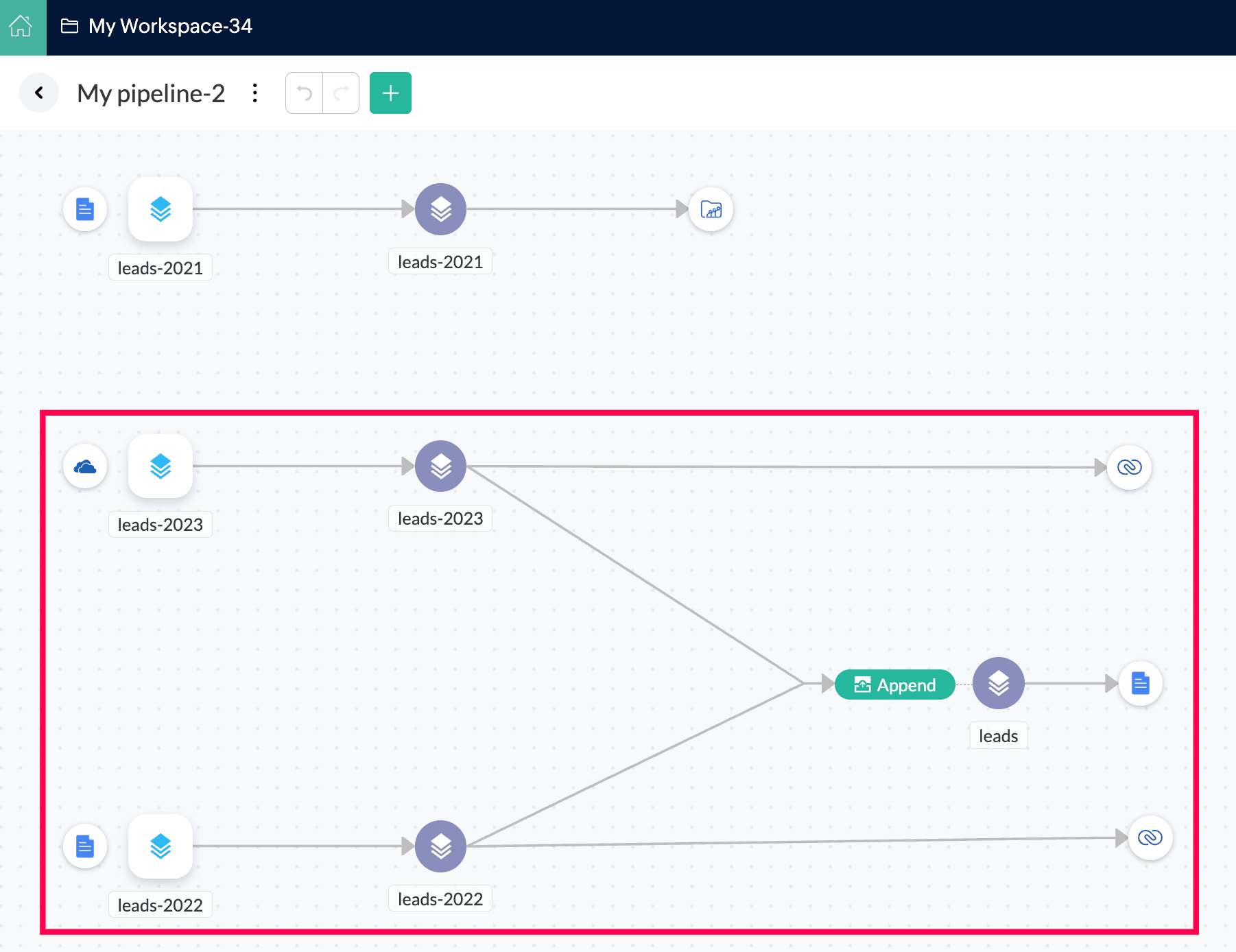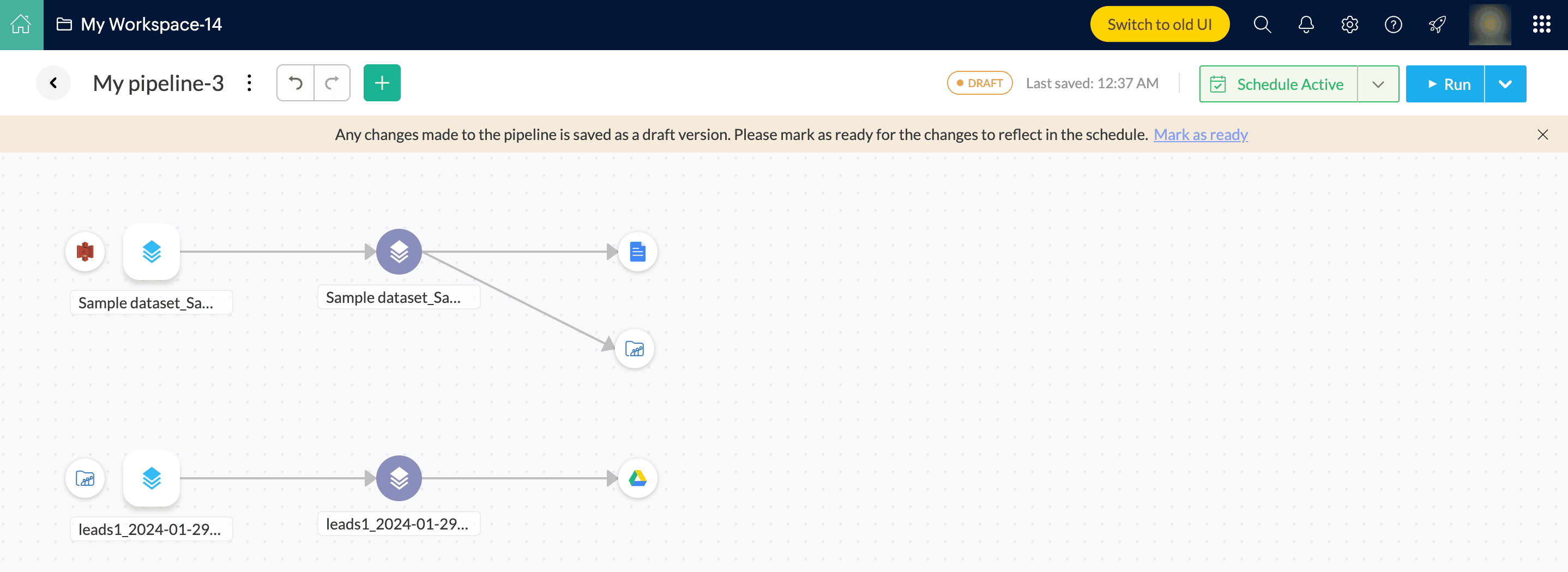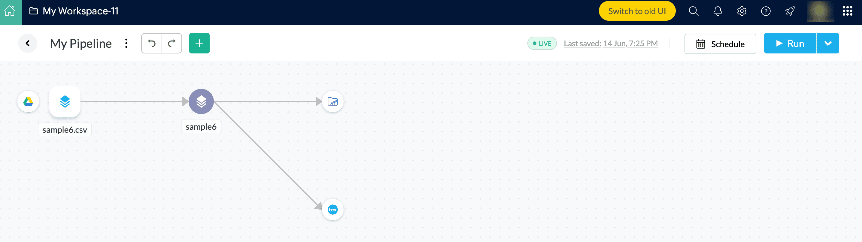 メモ: ワークスペースに返品するには、戻るアイコンまたはWorkspace名前をクリックしてください。パイプライン名の名前を変更することもできます。