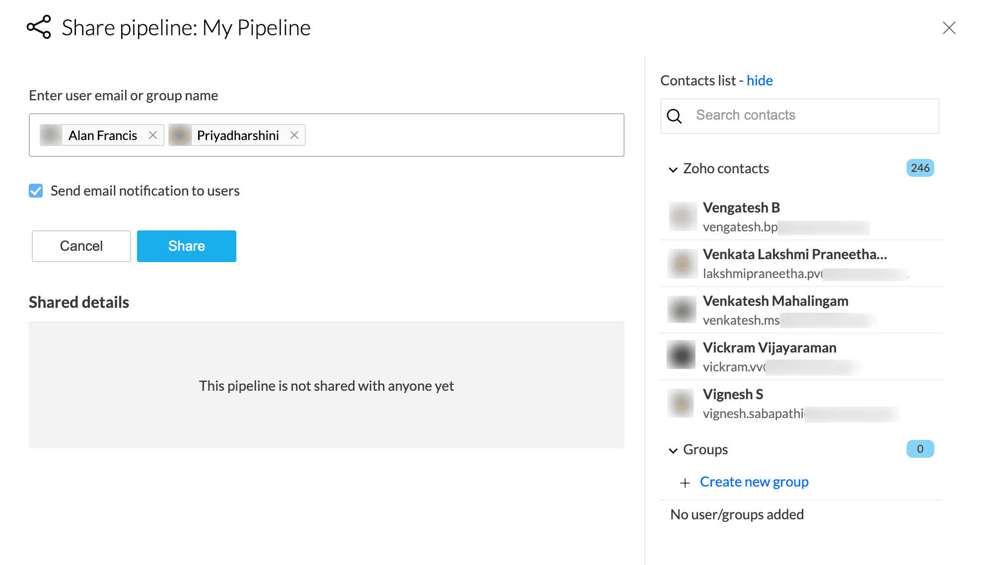 「共有する」をクリックすると、パイプラインをユーザーやグループと共有できます。