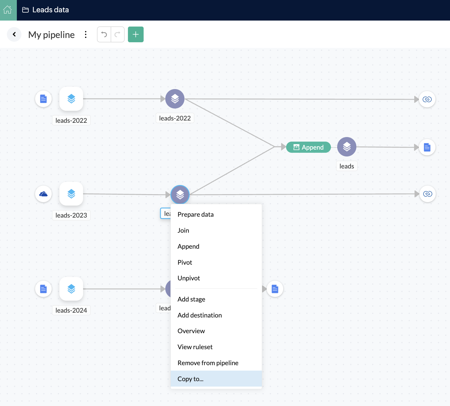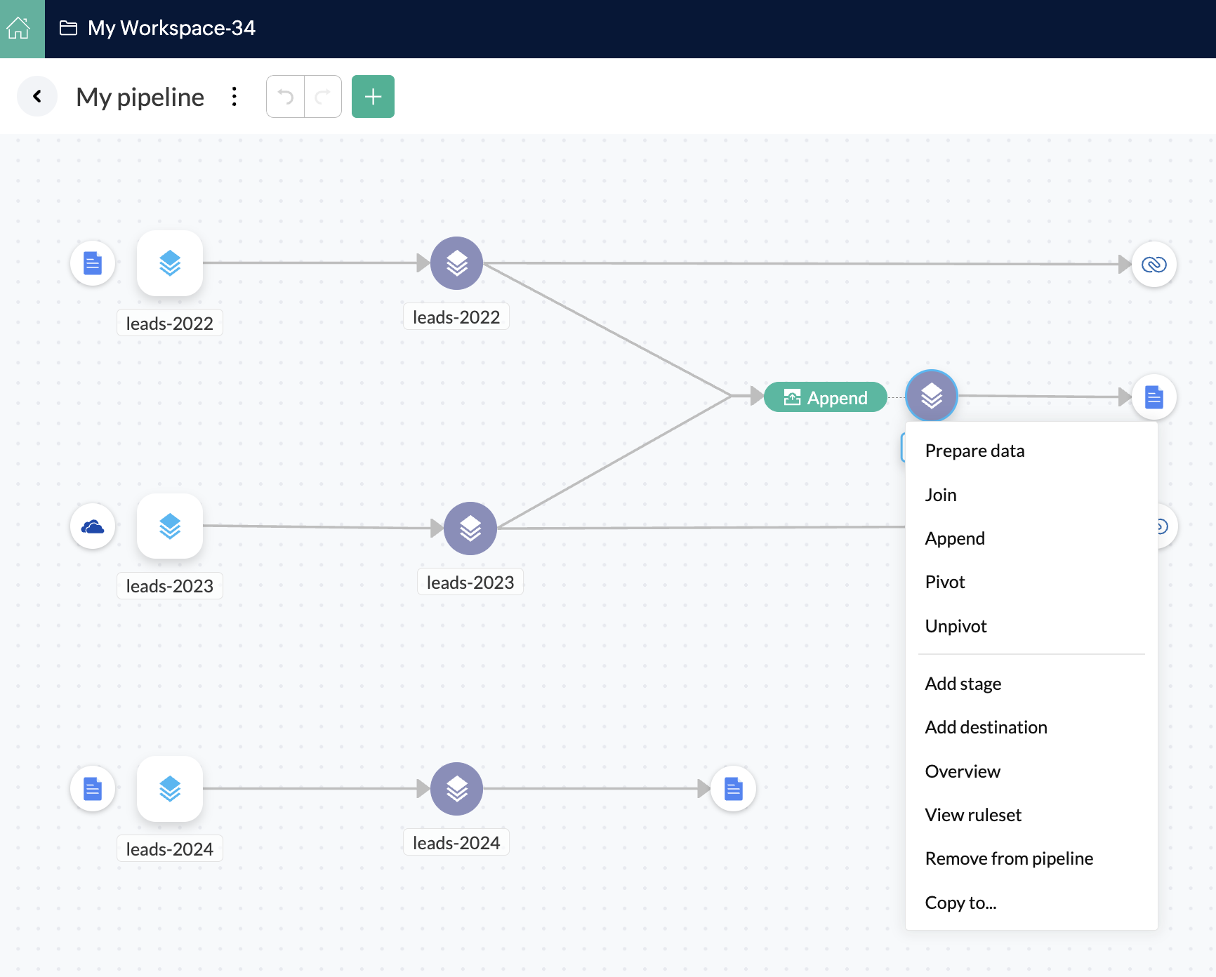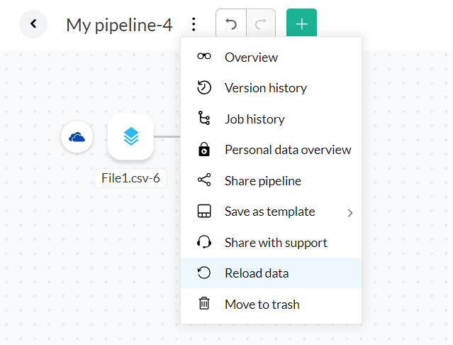 パイプラインビルダー上部のデータをインポートする アイコンをクリックすると、複数のソースからパイプラインにデータを取り込むことができます。