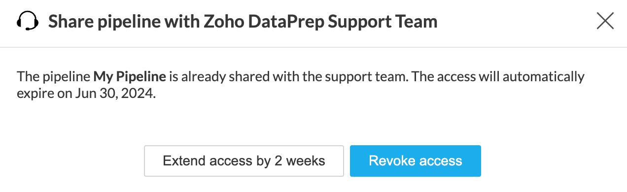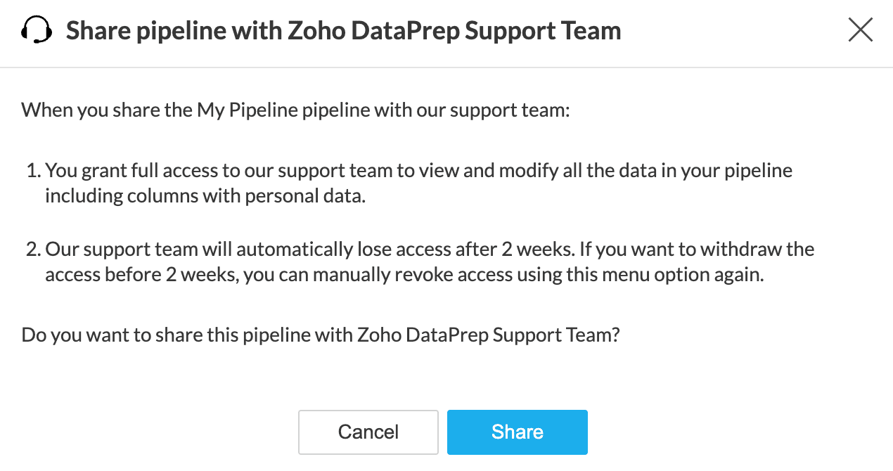サポートチームに、個人データを含む列をはじめとするパイプライン内のすべてのデータの表示および編集権限を完全に付与します。続行する場合は、共有するオプションをクリックしてください。