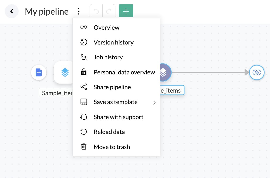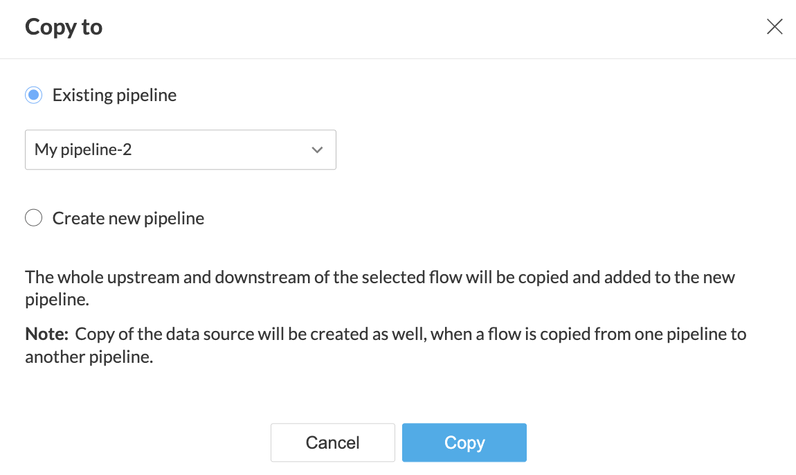 このオプションを使用して、パイプラインを削除し、ごみ箱に移動します。削除されたパイプラインは、ワークスペースページのごみ箱タブで確認できます。エンティティを復元するか、ごみ箱から完全に削除することが可能です。ごみ箱内の商品は180日後に完全に削除されます。