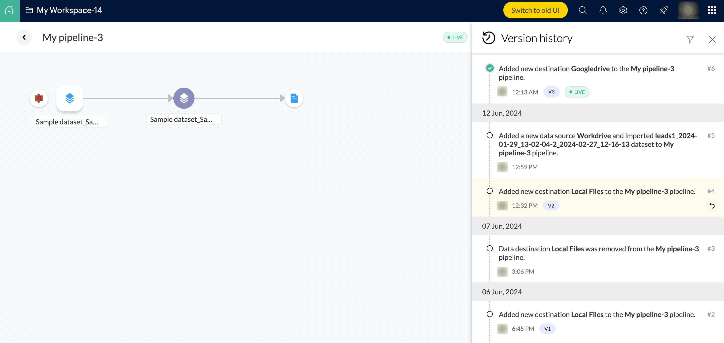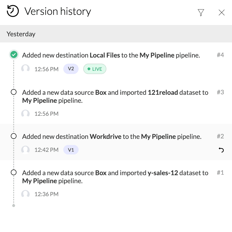 バージョン履歴は、パイプライン内のすべての処理履歴を管理するのに役立ちます。公開済みの過去バージョン一覧や、現在有効なバージョンを表示できます。