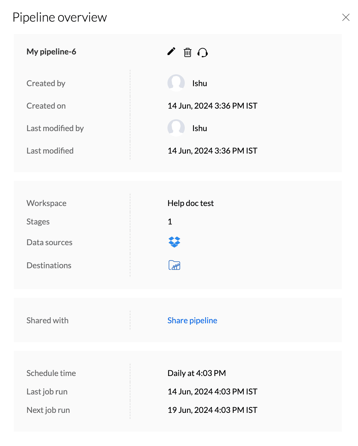 パイプラインビルダーの三点リーダーアイコンを選択し、概要メニューをクリックします。パイプラインの概要では、パイプライン名、作成者、作成日、最終更新日時、最終更新ユーザー、ワークスペース名、ステージ、データソース、デスティネーション、共有ユーザー、スケジュール時刻、最新のジョブ実行、次回のジョブ実行などの詳細を確認できます。また、パイプライン概要から名前の変更、削除、共有も行えます。
