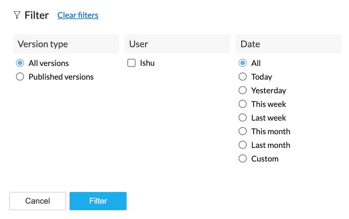 履歴表示基準の初期設定では、パイプライン内のすべての処理が時系列順に表示されます。必要に応じて、フィルターを使用してバージョンタイプ、ユーザー、日付ごとに履歴を表示できます。