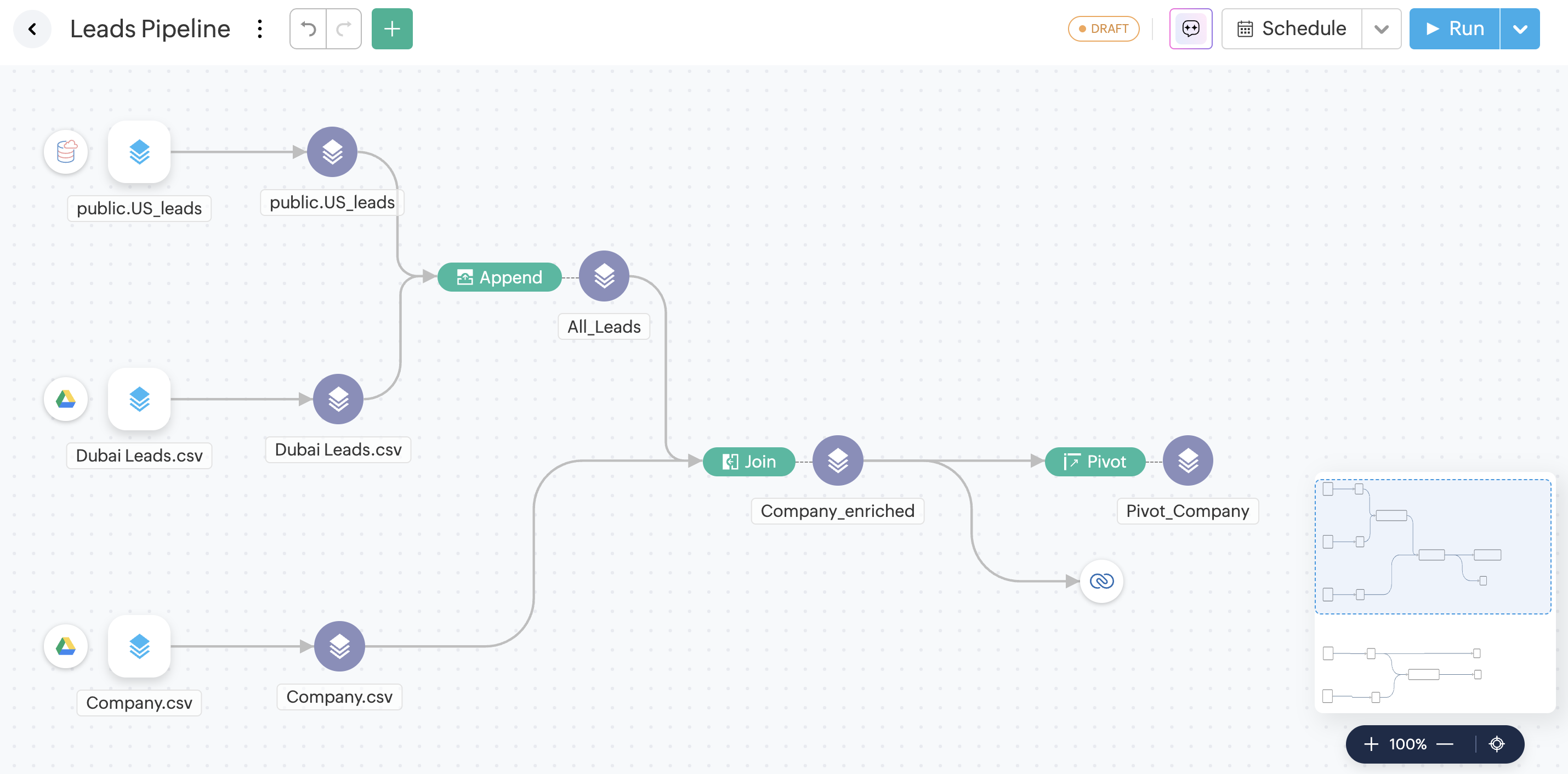 Pipeline builderは、ユーザーがDataPrepで複数のデータステージや様々なフロー単位の変換を含むデータフローを作成できるツールです。新規pipelineが作成されると、pipeline builderページが開きます。pipeline builderページには、パイプラインに関するすべての関連情報が表示されます。これには、パイプラインの詳細、データ元の詳細、データセットの詳細、出力先の詳細、さらにundoやredo、データのインポート、バージョン履歴、スケジュール、実行、パイプライン設定などの設定が含まれます。