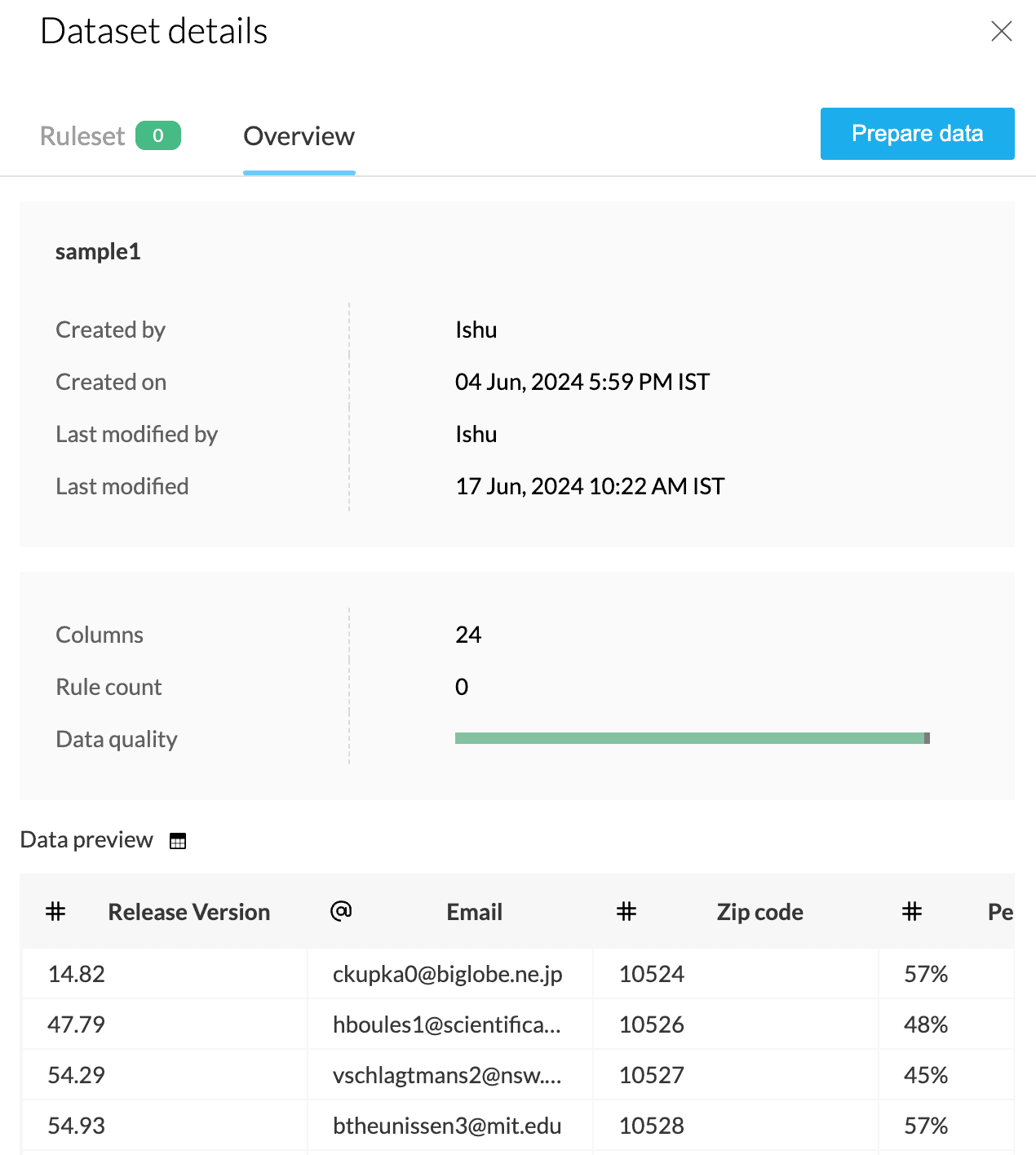 データセットの概要: 概要では、データセットの名前、作成者、作成日、最終更新者、最終更新日、列、ルール件数、データ品質、データプレビューが一覧表示されます。