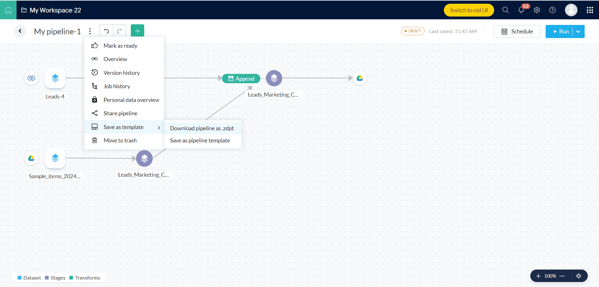 また、pipelineテンプレートをダウンロードし、ダウンロードする pipeline as .zdpt オプションを使って利用できます。