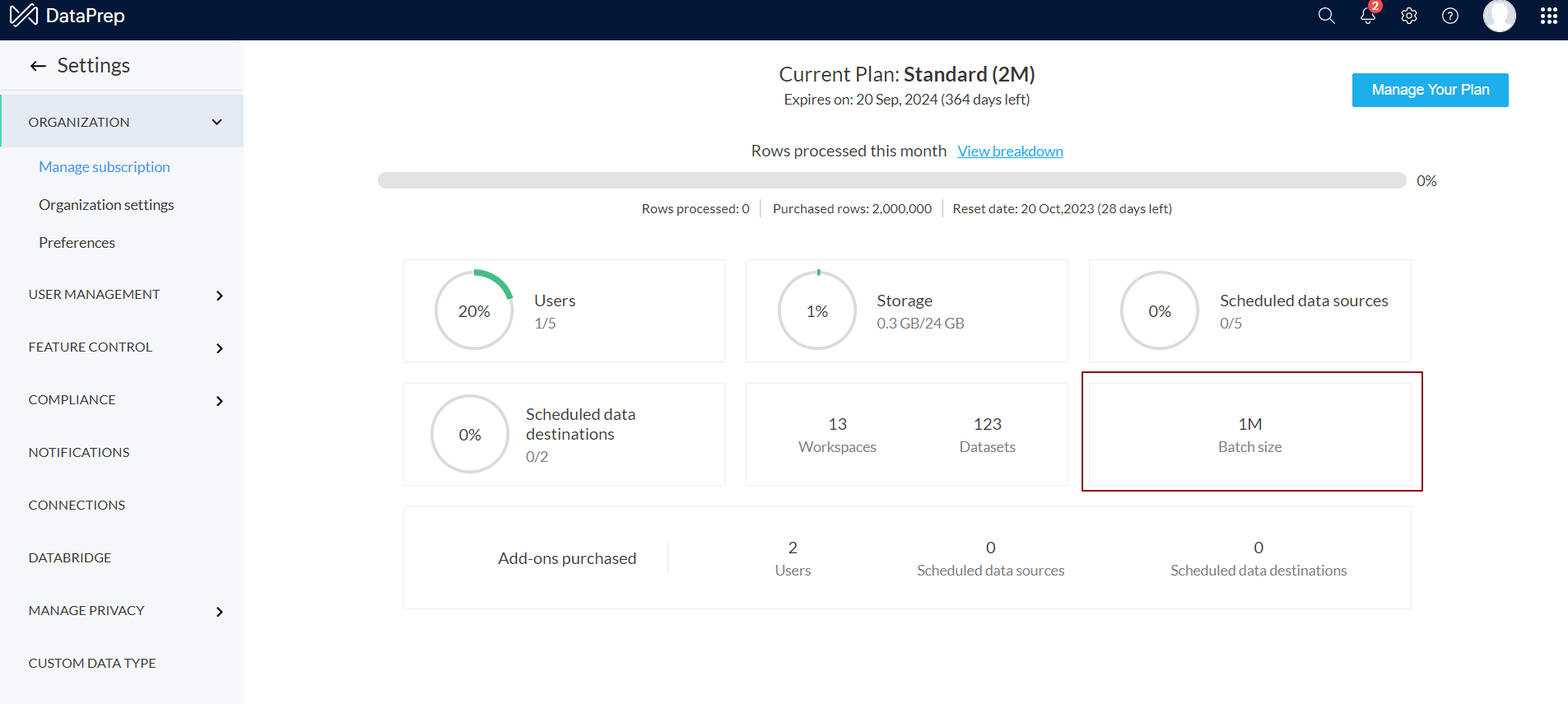Zoho DataPrepのサブスクリプション管理タブで、DataPrep組織に許可されているバッチサイズ制限を確認できます。バッチサイズ追加オプションを購入したい場合は、プラン管理をクリックしてZohoストアへアクセスしてください。バッチサイズ追加オプションの購入方法については、こちらをクリックしてください。