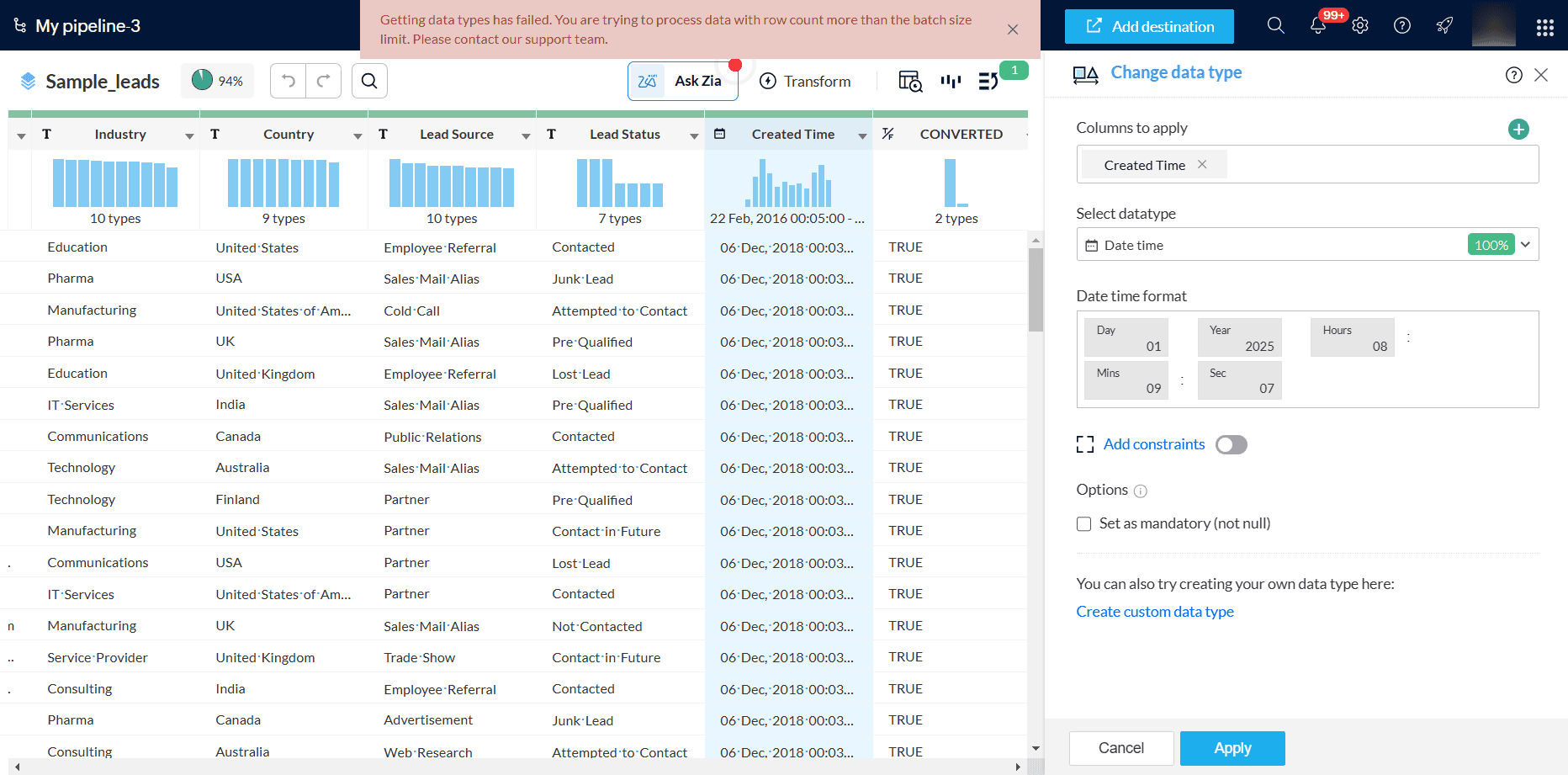 バッチサイズ上限を超えるデータをファイル、クラウドストレージ、FTP、URLなど他のデータソースからインポートしようとした場合、ファイルの初回解析後に行数が判明するため、データセット自体はインポートされます。しかし、変換処理を適用しようとすると、下記のエラーが表示されます。バッチサイズ上限を超えたデータセットで利用可能な操作や制限される操作については、こちらをクリックしてください。
