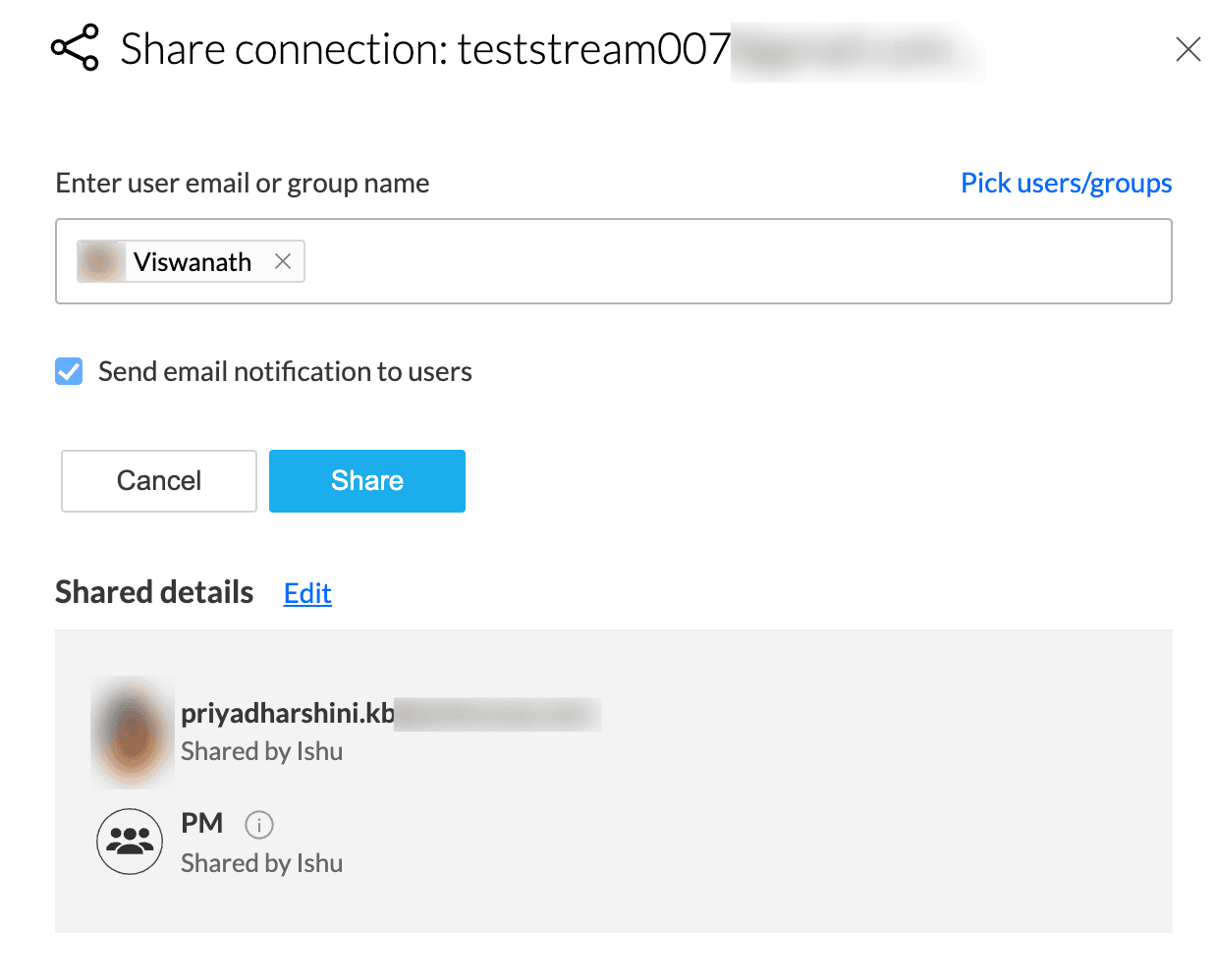 6. 共有するボタンをクリックし、接続を必要なユーザーと共有します。外部連携が正常に共有されました。編集オプションをShared 詳細内で使用することで、必要に応じて変更やユーザー・グループの削除が可能です。