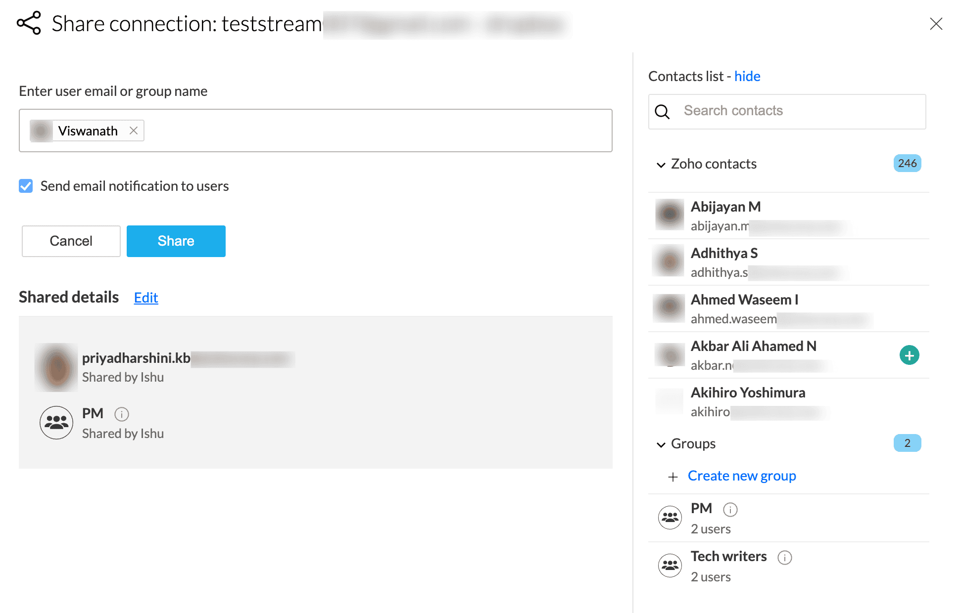 5. 連絡先に登録されている既存ユーザーやグループを追加する場合は、共有パネル右上のユーザー/グループを選択オプションをクリックします。